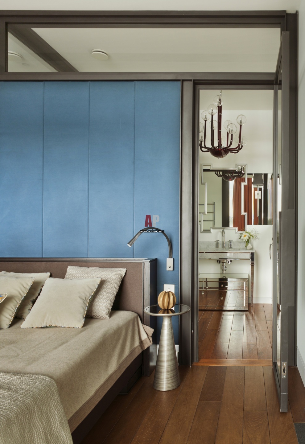 Интерьер квартиры для отдыха у воды. В обивке изголовья кровати использована алькантара насыщенного сине-бирюзового цвета. Справа – вход в ванную комнату.