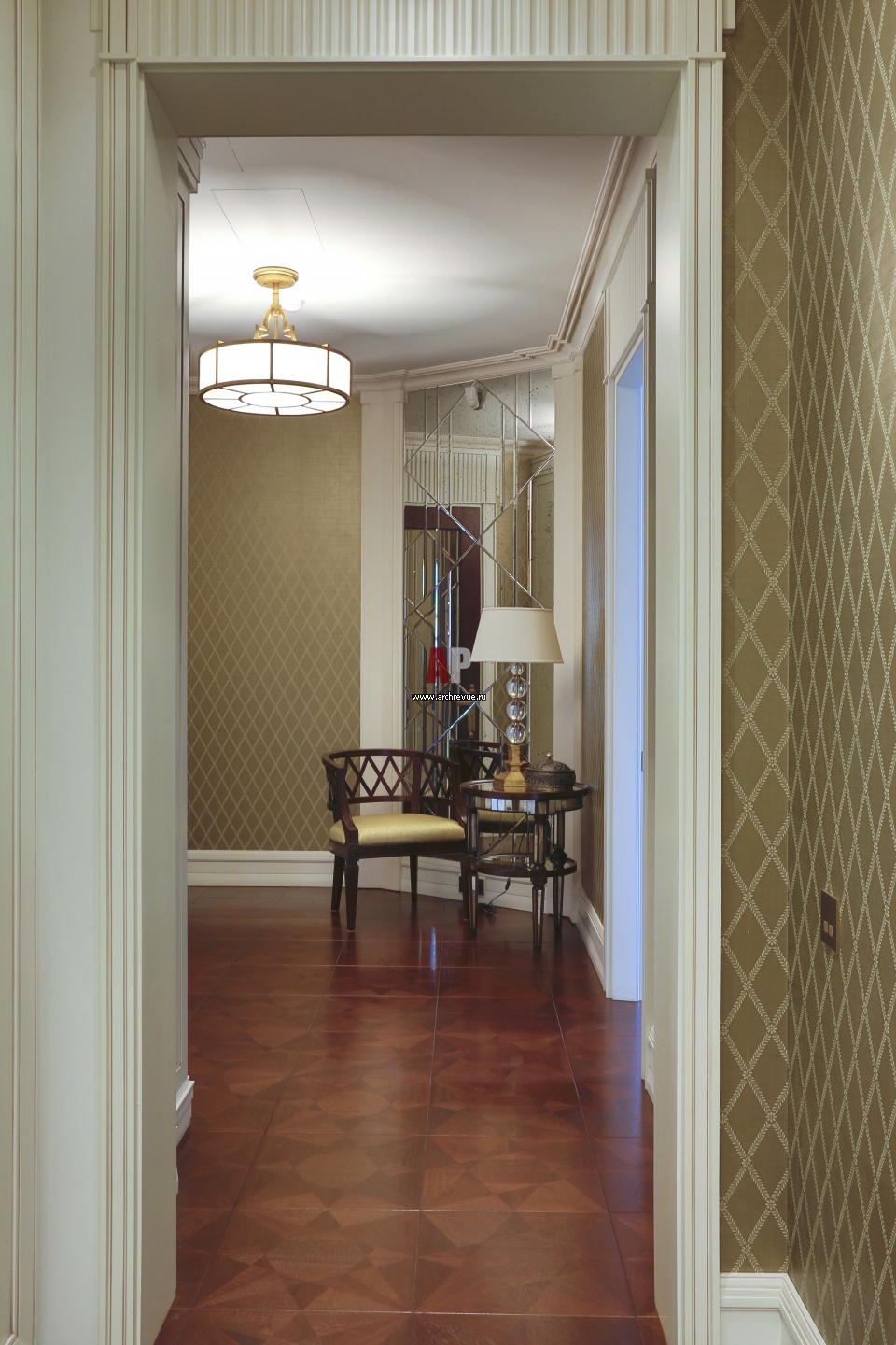 Зона отдыха в нише с зеркалом. Рисунок зеркала отсылает к стилистике ар-деко. Высокие дверные порталы зрительно увеличивают потолки.