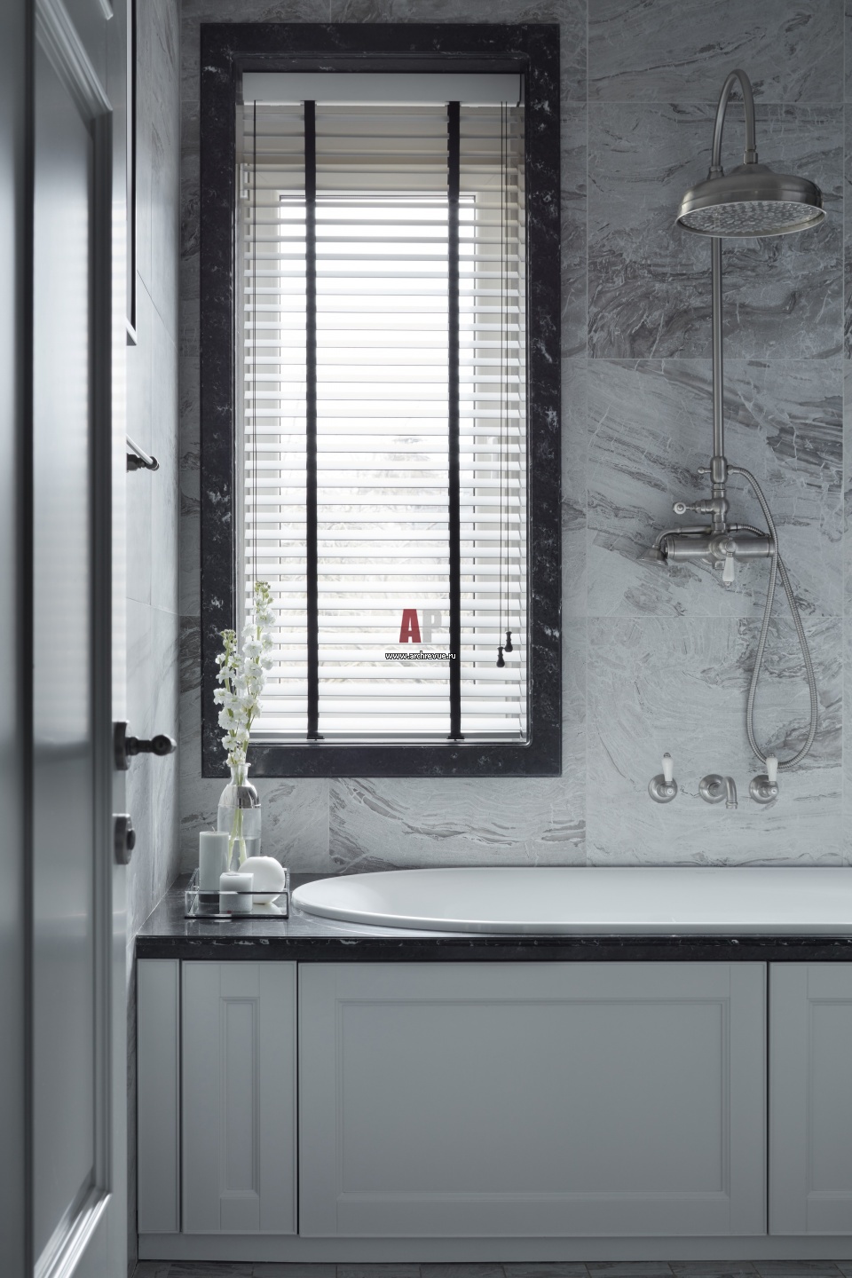 Стены и пол ванной комнаты облицованы серым керамогранитом Rex. Обрамление окна, столешница ванны выполнены из темного кварцита. На окне установлены жалюзи, которые подчеркивают форму оконного проема. Ванна, Villeroy & Boch. Смеситель, Nicolazzi.