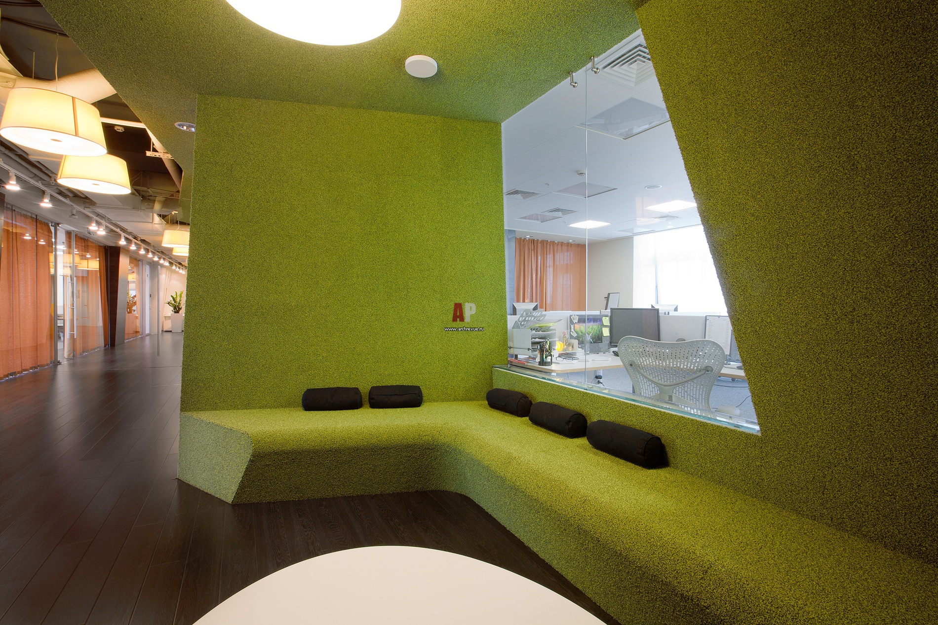 Вид со стороны зоны отдыха на рабочее пространство. На потолке open space – акустические Ecophon, хорошо поглощающие звук. Авторы проекта Петр Зайцев, Арсений Борисенко, архитектурное бюро za bor.
