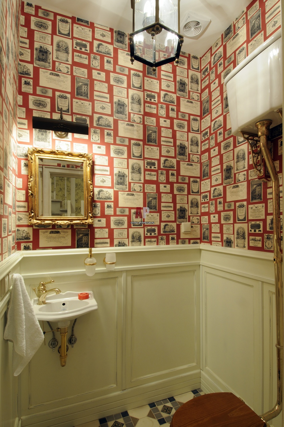 Гостевой санузел в английском стиле. Низ стены – деревянные панели, верх – обои от Lewis & Wood. На полу – керамическая плитка Winckelmans, поставщик «Грета Вульф».