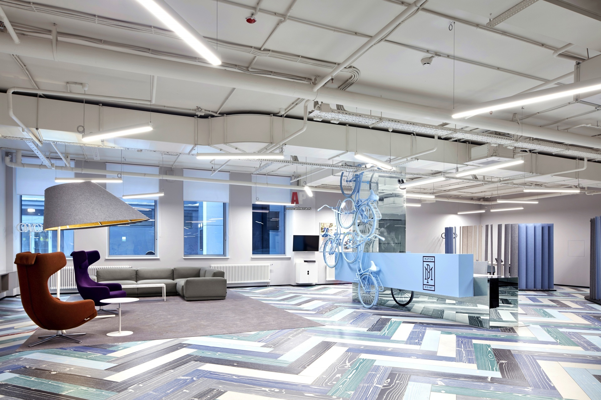 Офис занимает один просторный зал. Стойка ресепции облицована искусственным камнем серо-голубого цвета. На полу - керамогранит, он имитирует деревянный паркет с укладкой «елочкой» в сине-серой гамме.