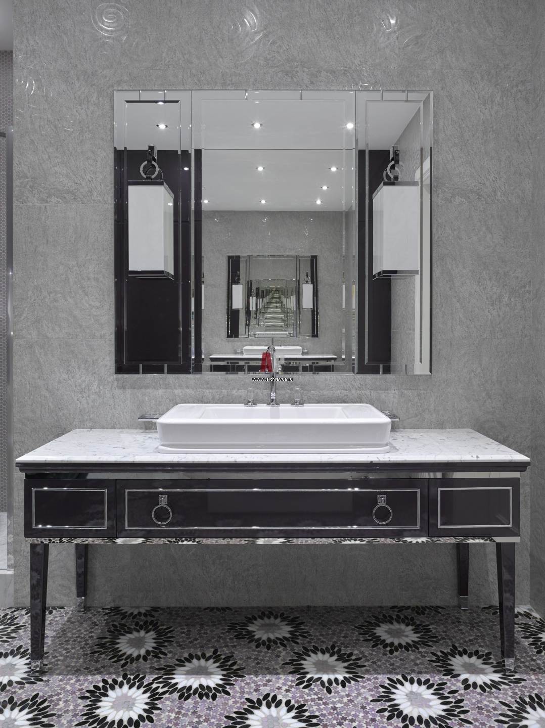 Гостевой санузел на втором этаже решен в черно-белой гамме. На полу – мозаичное панно. Сантехника, Villeroy & Boch. Смесители, Dornbracht.