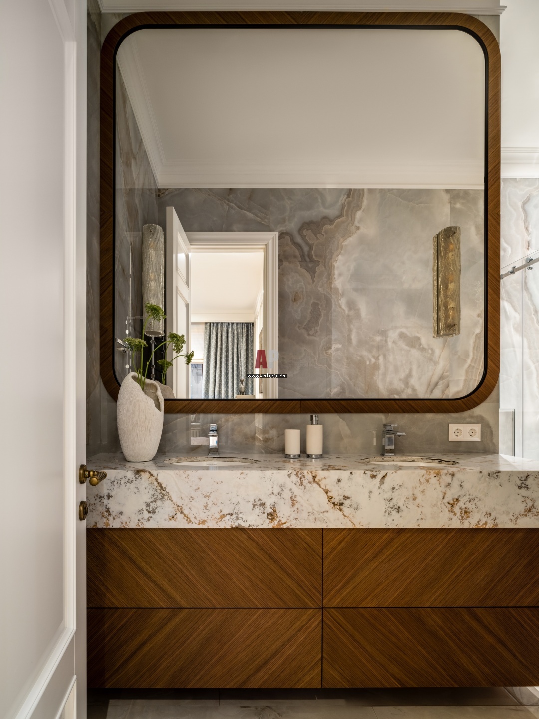 Квартира для музыкальной семьи. Интерьер хозяйского санузла. Умывальник с двумя раковинами изготовлен на заказ. Сантехника, Victoria + Albert.
