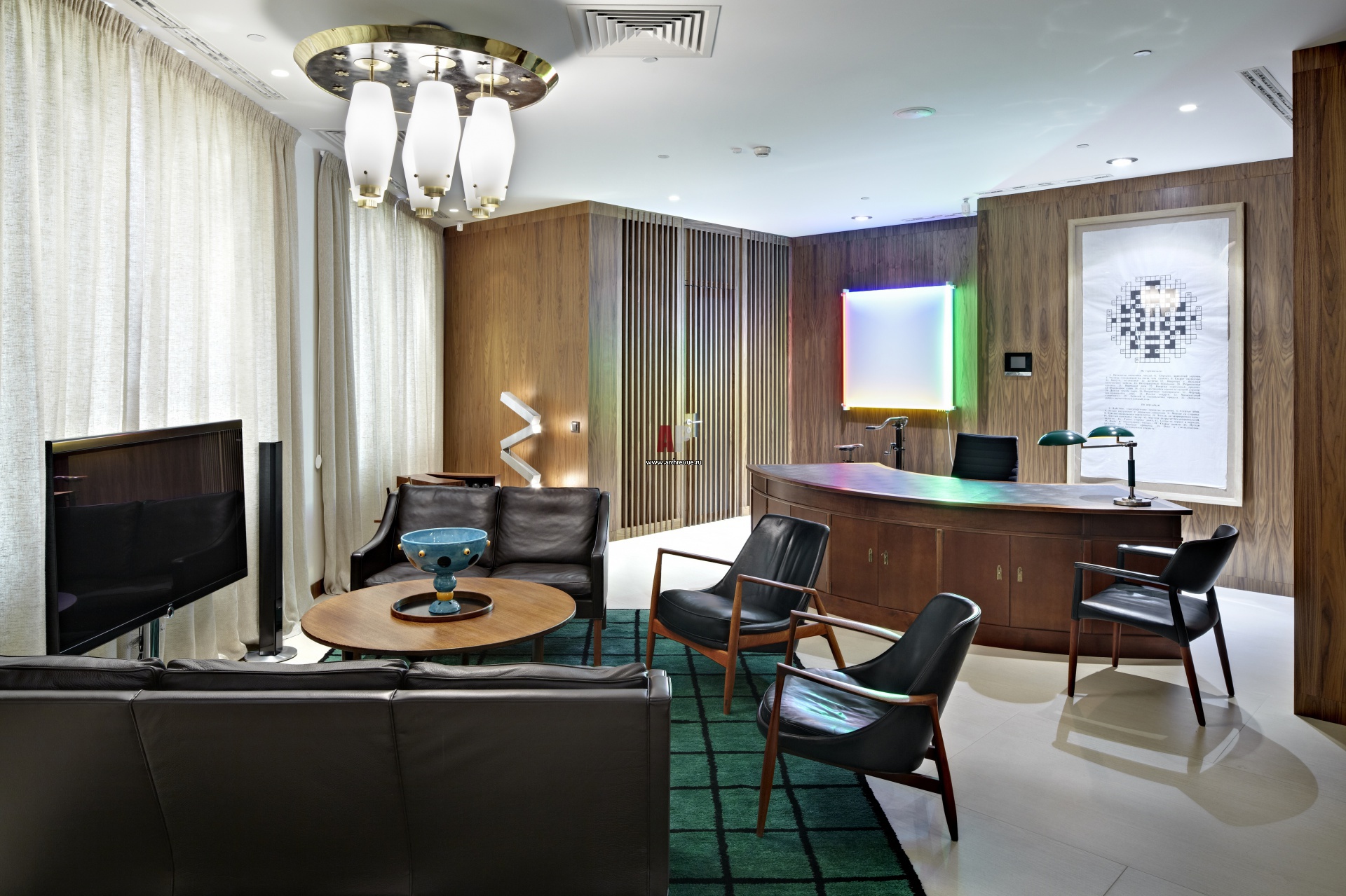 Архитектура в духе 60-х продиктовала и дизайн в сходной ретро-стилистике: интерьер наполнен шедеврами дизайна 1950-х - 70-х годов.