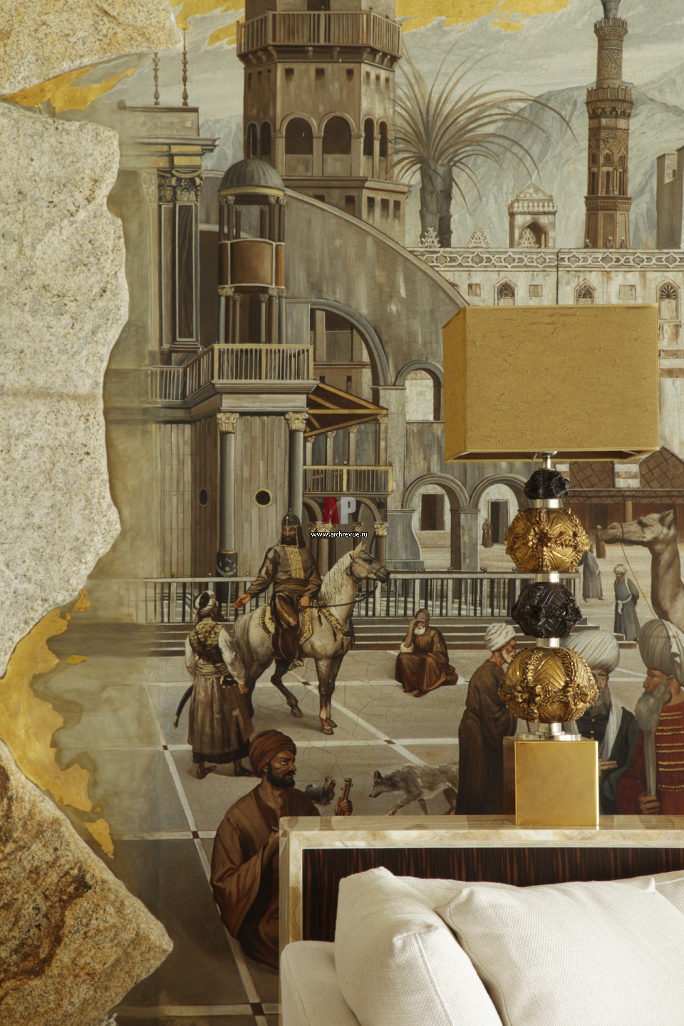 Роспись на стене отсылает к эпохе итальянского Ренессанса.