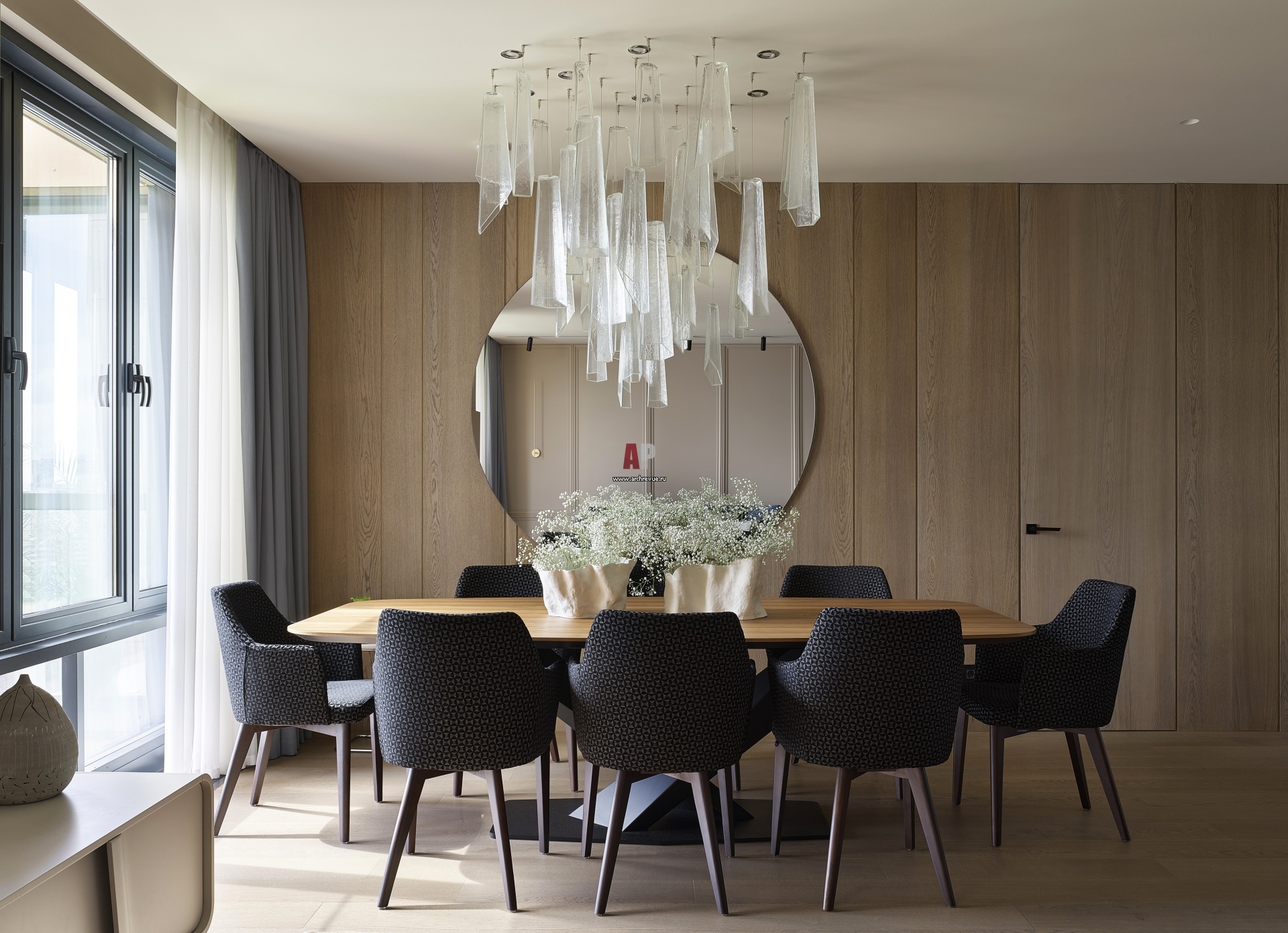 Одна стена в гостиной зашита деревянными панелями с теплой текстурой, в вертикальную композицию встроена дверь-невидимка, ведущая в родительскую зону. Инженерная доска Coswick, дуб «Шамбор». Обеденный стол, консоль, Cattelan Italia.