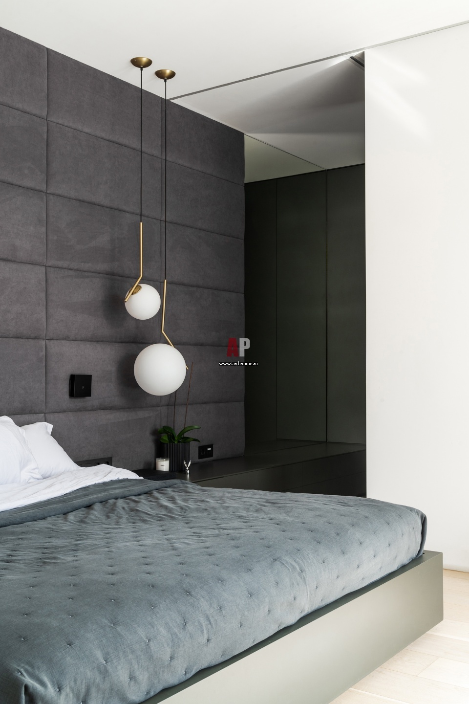 Хозяйская спальня. Стена за изголовьем кровати до потолка обита бархатистыми текстильными панелями серого цвета.