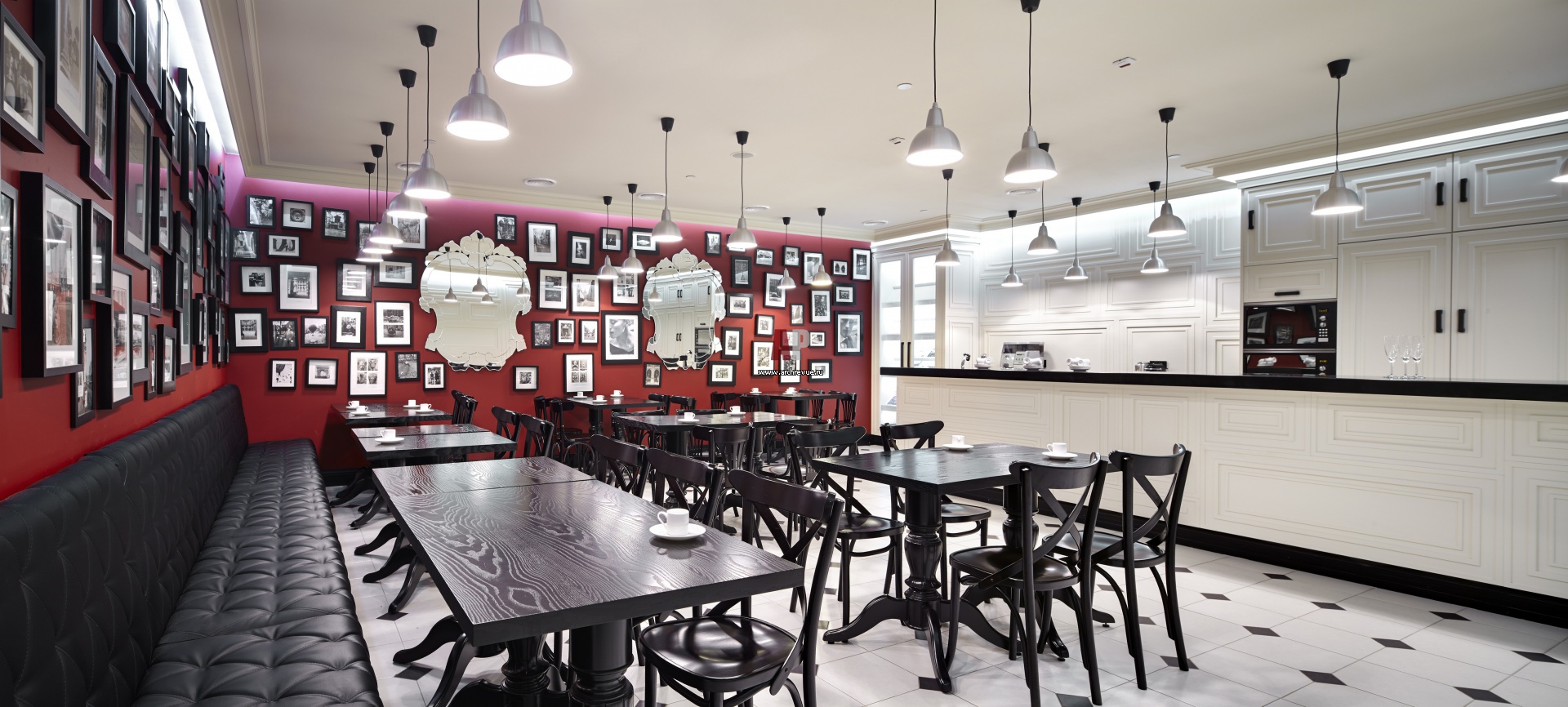 Кафе для сотрудников в офисе в европейском стиле. Одна из стен выкрашена в яркий бордовый цвет, кухня с баром зашиты белыми деревянными панелями с филенками. Диваны с оформлением каретной стяжкой из черной кожи.