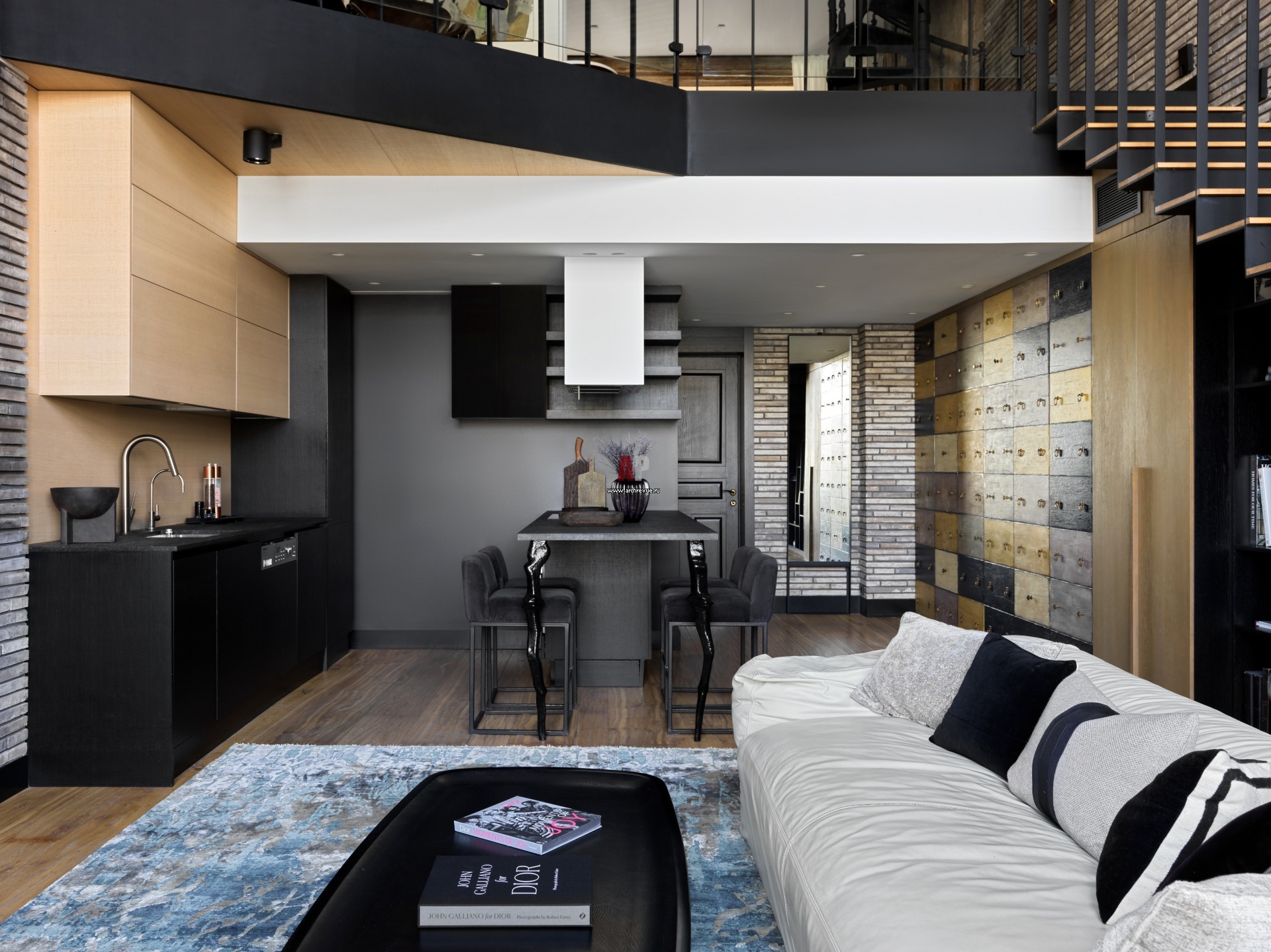 На первом этаже квартиры расположены кухня и большая гостиная со вторым светом. Справа – оригинальные шкафы с вертикальными фасадами, которые напоминают уложенные друг на друга выдвижные ящики. Они были изготовлены на заказ и многослойно окрашены для создания винтажного эффекта. Сначала механическим способом были сделаны трещины, затем на поверхность наносилось порядка 14 слоев различных лакокрасочных покрытий.