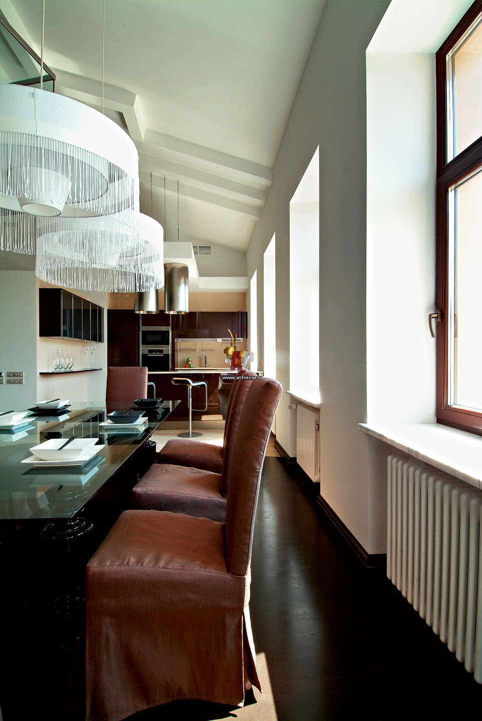 Столовая расположилась под скатом крыши. Она выделена плоскими светильниками-барабанами с бахромой фабрики MOOOI, поставщик «Домус Ауреа».