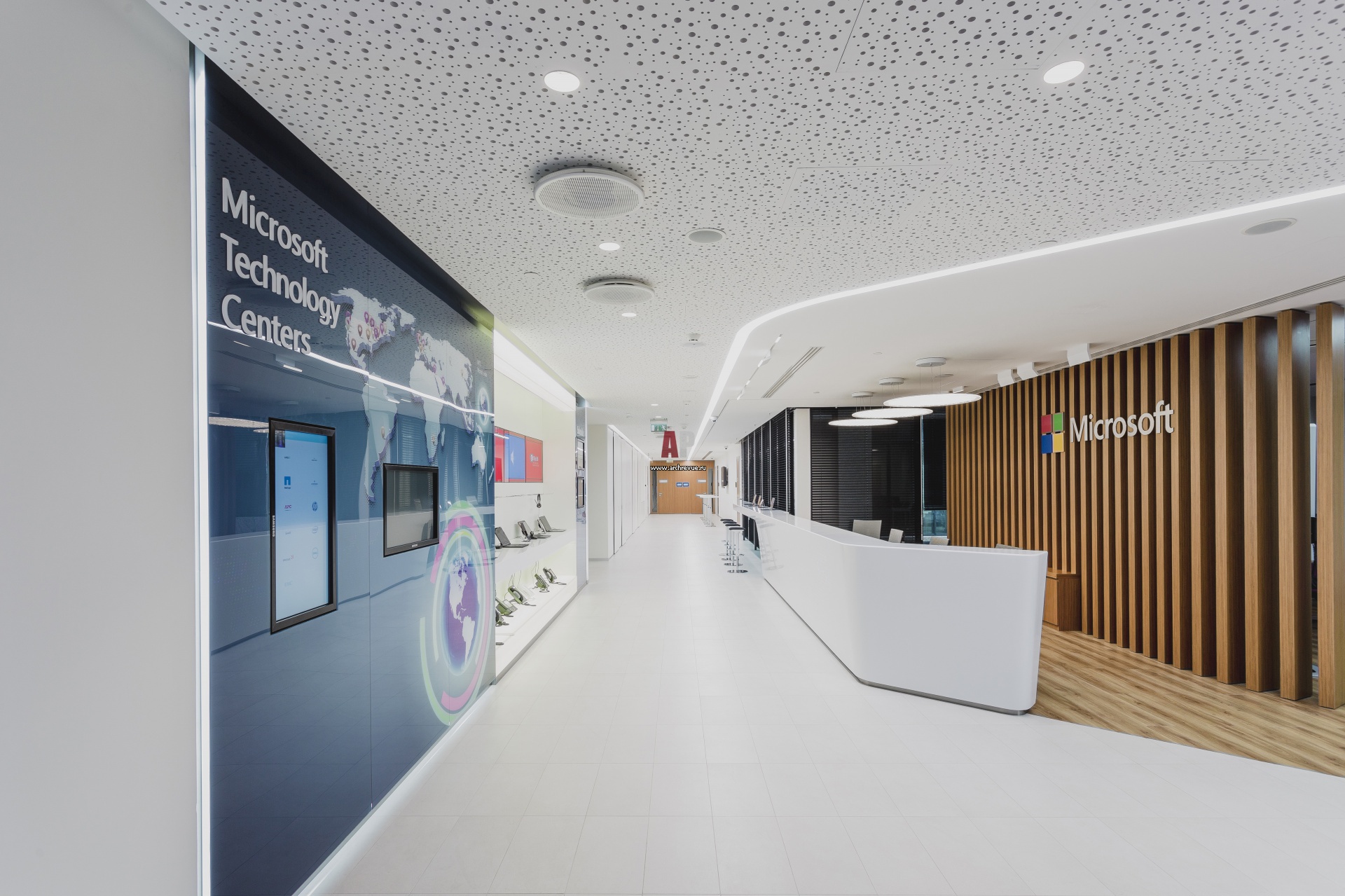 В центре П-образного плана располагается «космической» формы стойка ресепшен с вытянутой столешницей, переходящей в стойку hot-desk. Стойка выполнена из белого кориана.