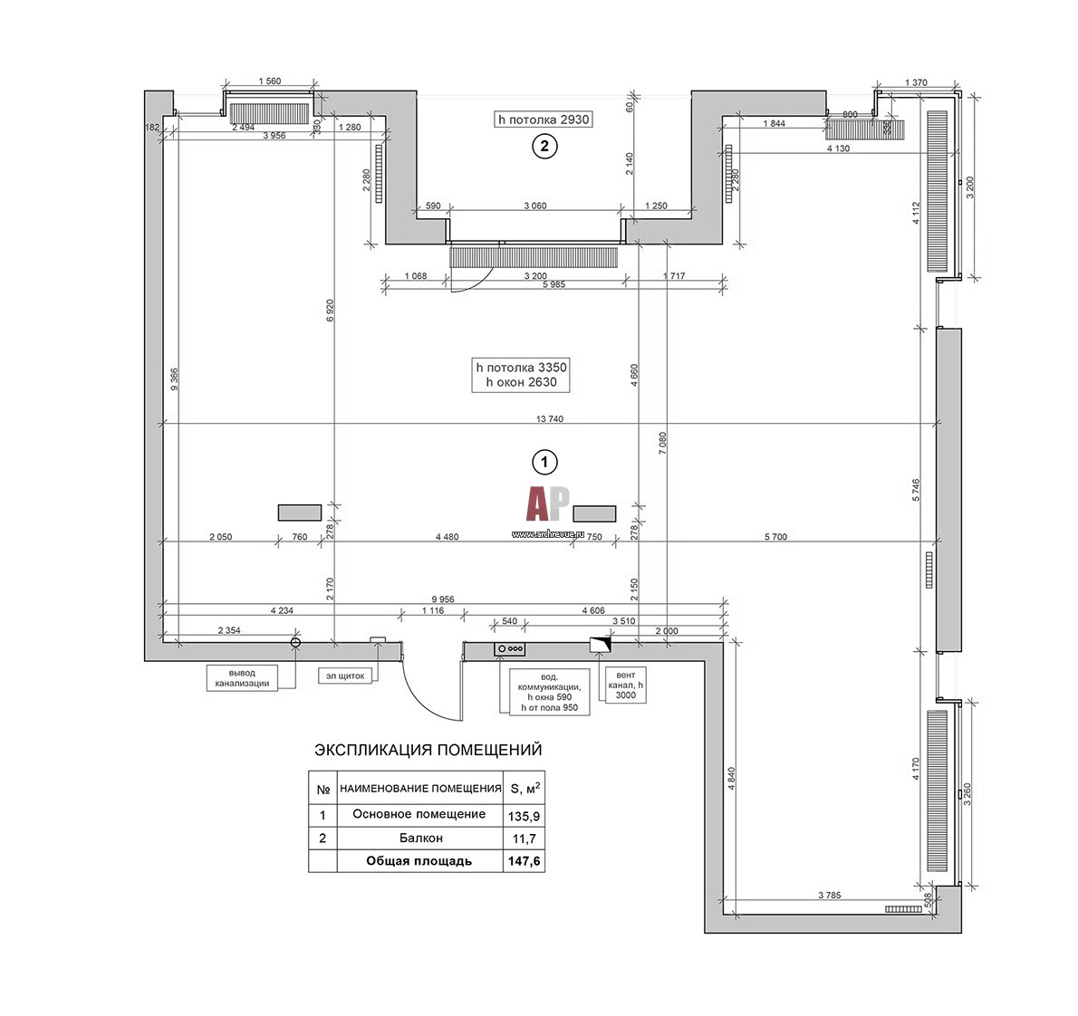 Обмерочный план квартиры в ЖК «Парк Рублево» с открытым балконом и выходом на участок. Общая площадь - 147,8 кв. м.