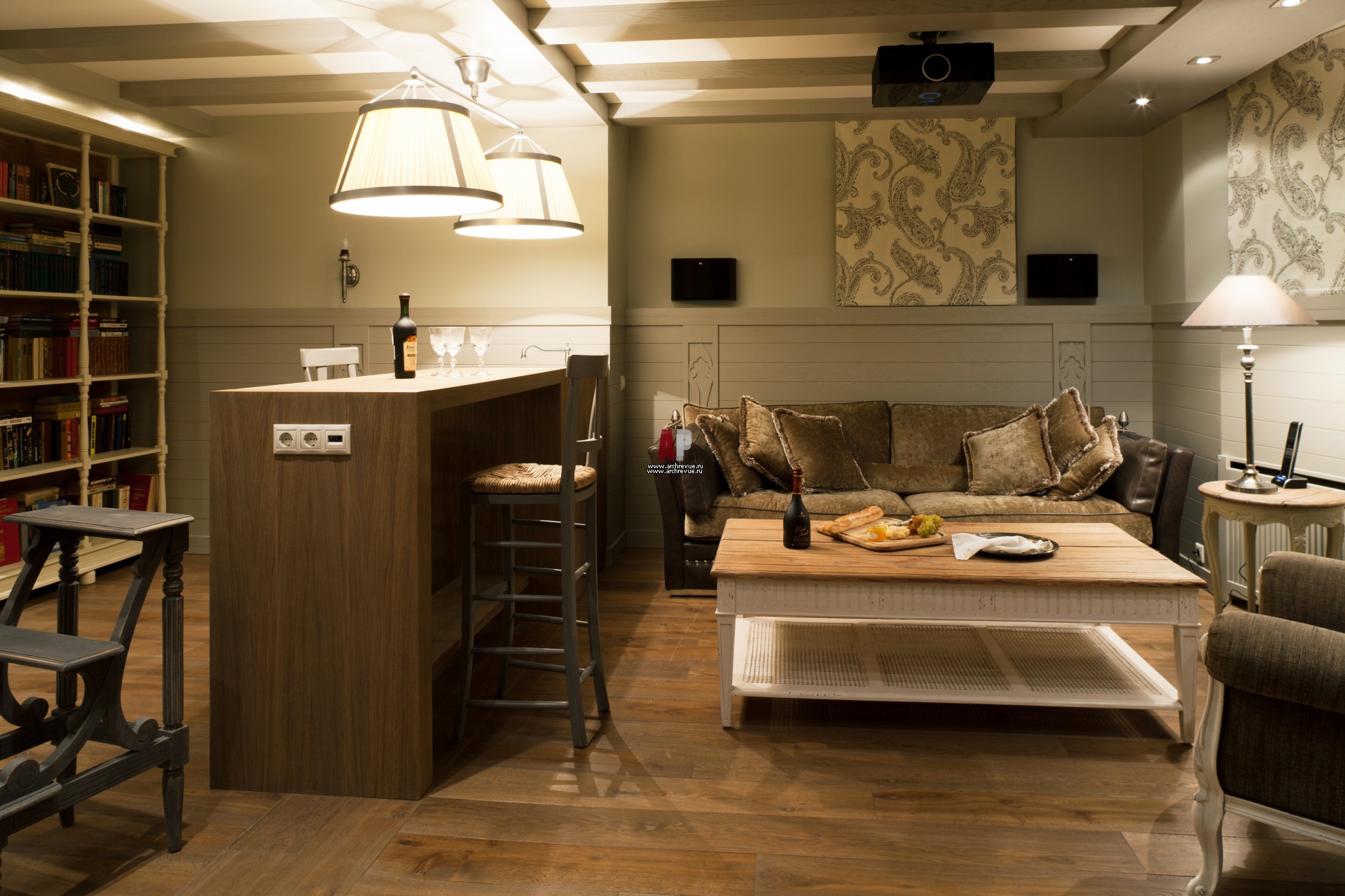 Цокольный этаж отведен под домашний кинотеатр и винотеку. Как и весь дом, он выполнен в стилистике прованс. Диван, S.A.T. Export. Журнальный стол, лесенка, стеллаж, WonderWood.