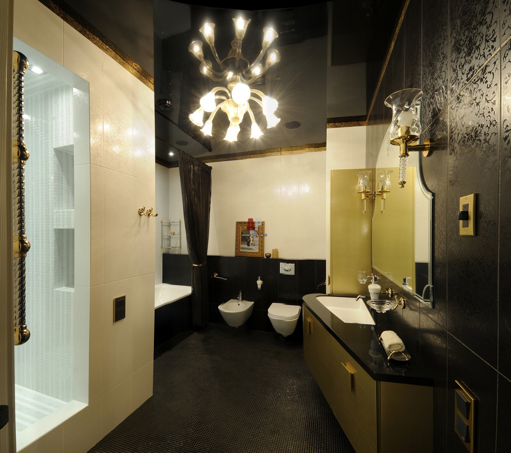 Полы выстланы мелкой черной мозаикой Bisazza, поставщик «Турбос», затертой золотым составом, благодаря чему поверхность напоминает змеиную кожу. Стеклянные двери и зеркала украшены авторскими вензелями, нанесенными пескоструйкой.
