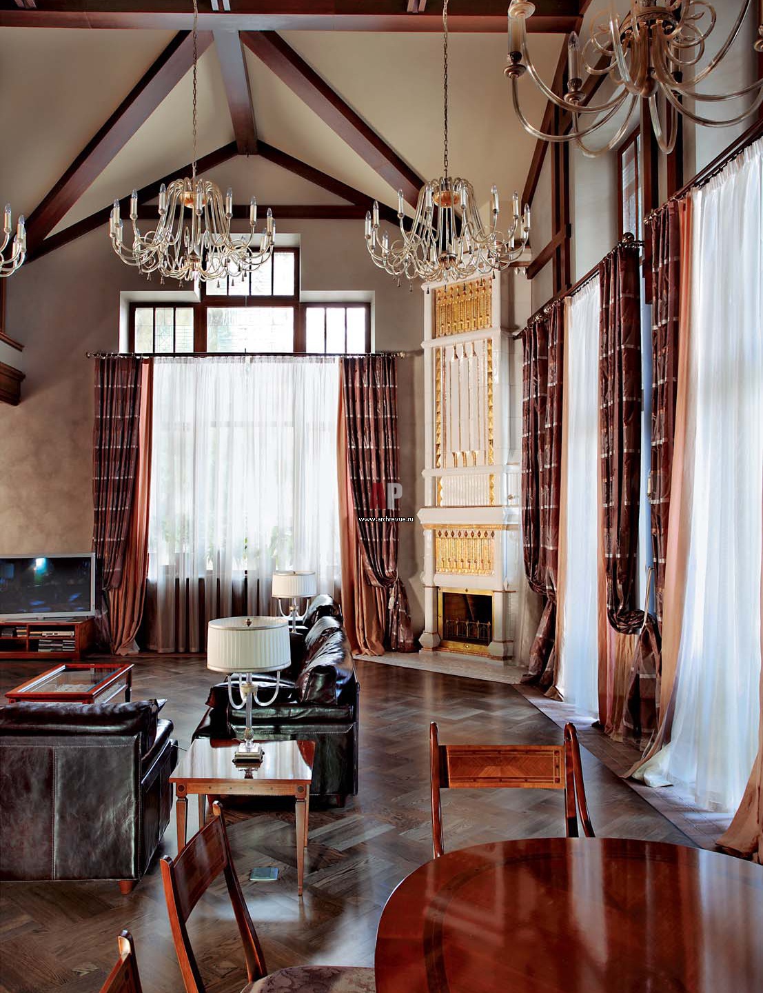В углу гостиной находится авторский камин. Он выполнен из состаренной керамики, сделанной вручную.