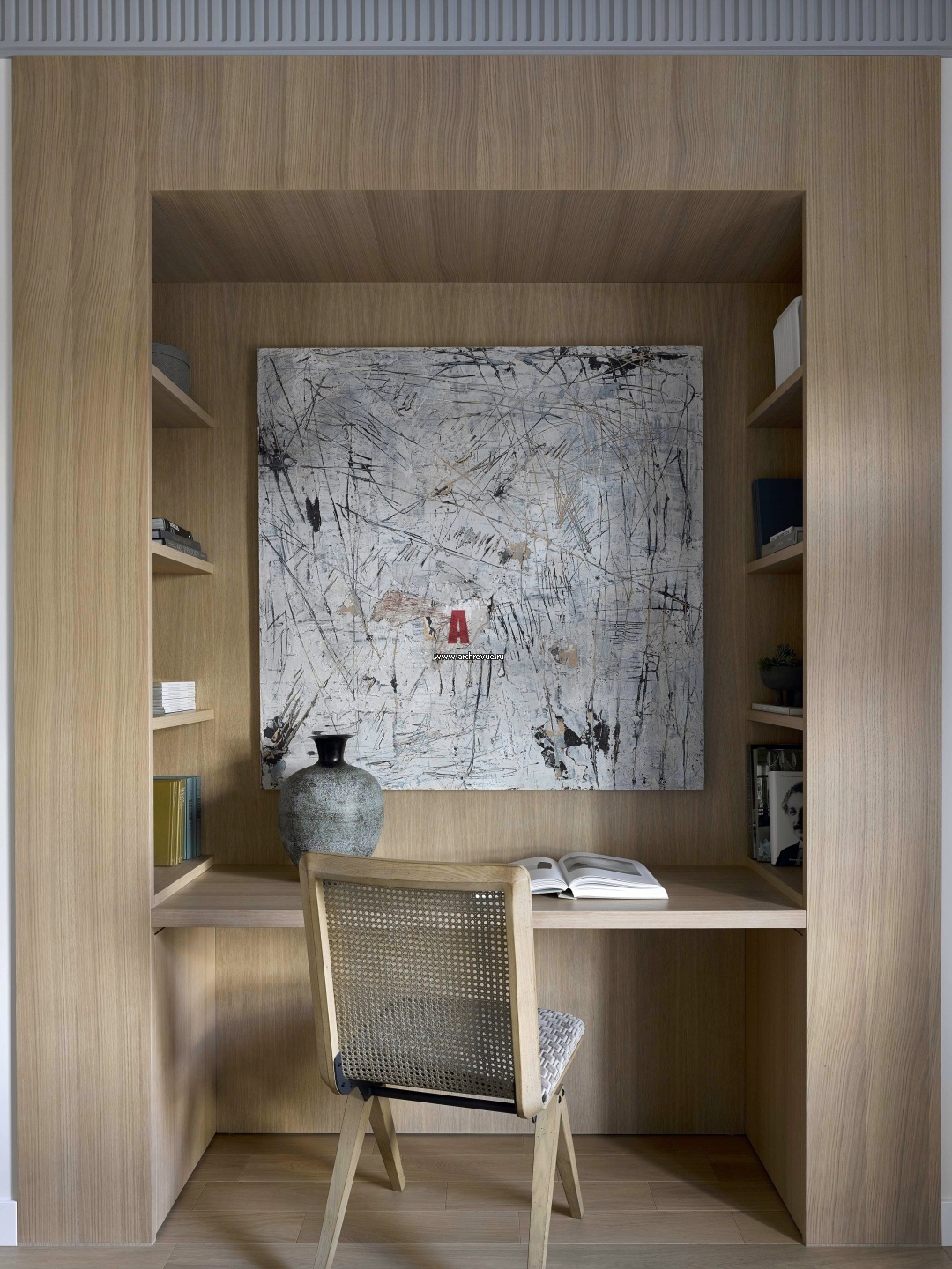 Спальня хозяев. В нише напротив кровати сделана рабочая зона. Мебель сделана на заказ, шпон натурального дуба. Картина работы Кирилла Басалаева.