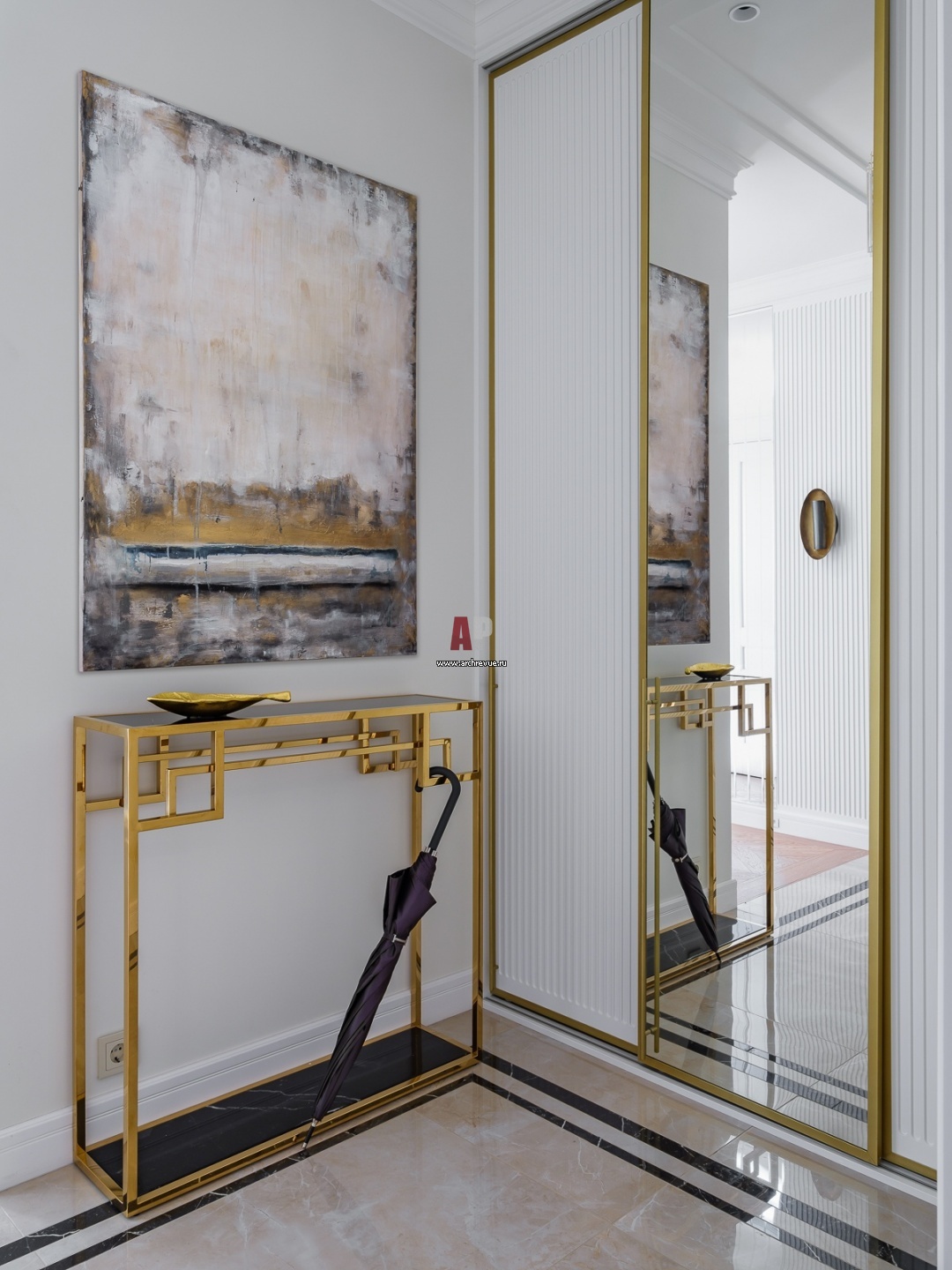 Основная идея интерьера – сохранить ощущение простора и свободы. Поэтому прихожая оформлена в светлой палитре, а консоль выполнена из золотистой латуни.