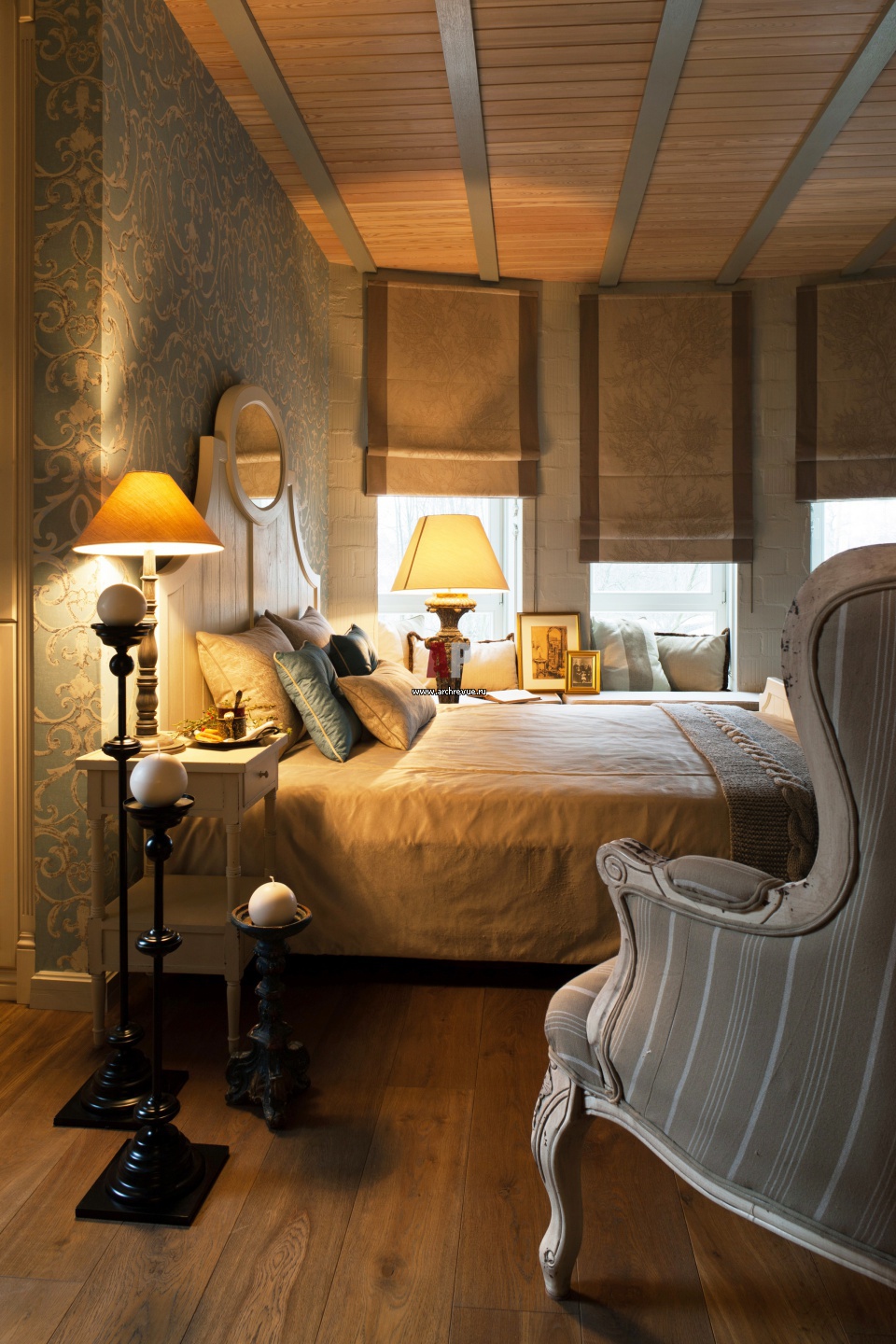 Интерьер спальни выдержан в стилистике неоклассики. Кресло, тумбочка, пуф WonderWood.