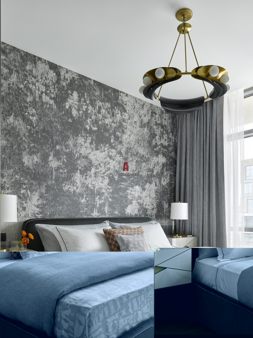 Гостевая спальня оформлена в нейтральной серой палитре. Обои, Black Edition. Кровать и тумбочки выполнены на заказ. Люстра, Hudson Valley Lighting. Настольные лампы, Visual Comfort & Co.