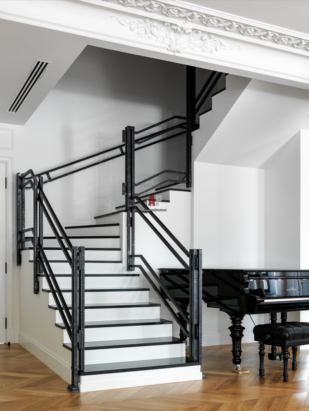Лестница в интерьере первого этажа. Сначала заказчики хотели перенести лестницу, а на ее месте установить лифт. Но потом решили оставить парадный лестничный марш. Ограждение лестницы выполнено из металла, выкрашенного в черный цвет. Оно контрастирует с белыми стенами.
