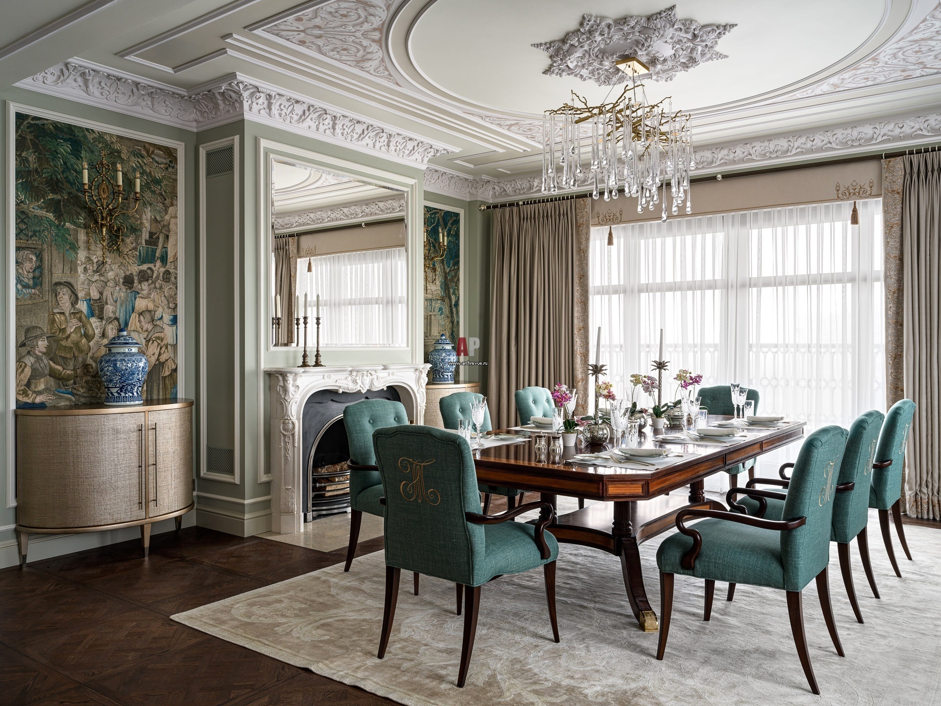 Сложная потолочная лепнина и изящная розетка задают торжественный ритм в столовой. Хрустальная люстра, John Richard. Массивный стол из темного дерева и стулья с вышитыми монограммами на спинках, Theodore Alexander.