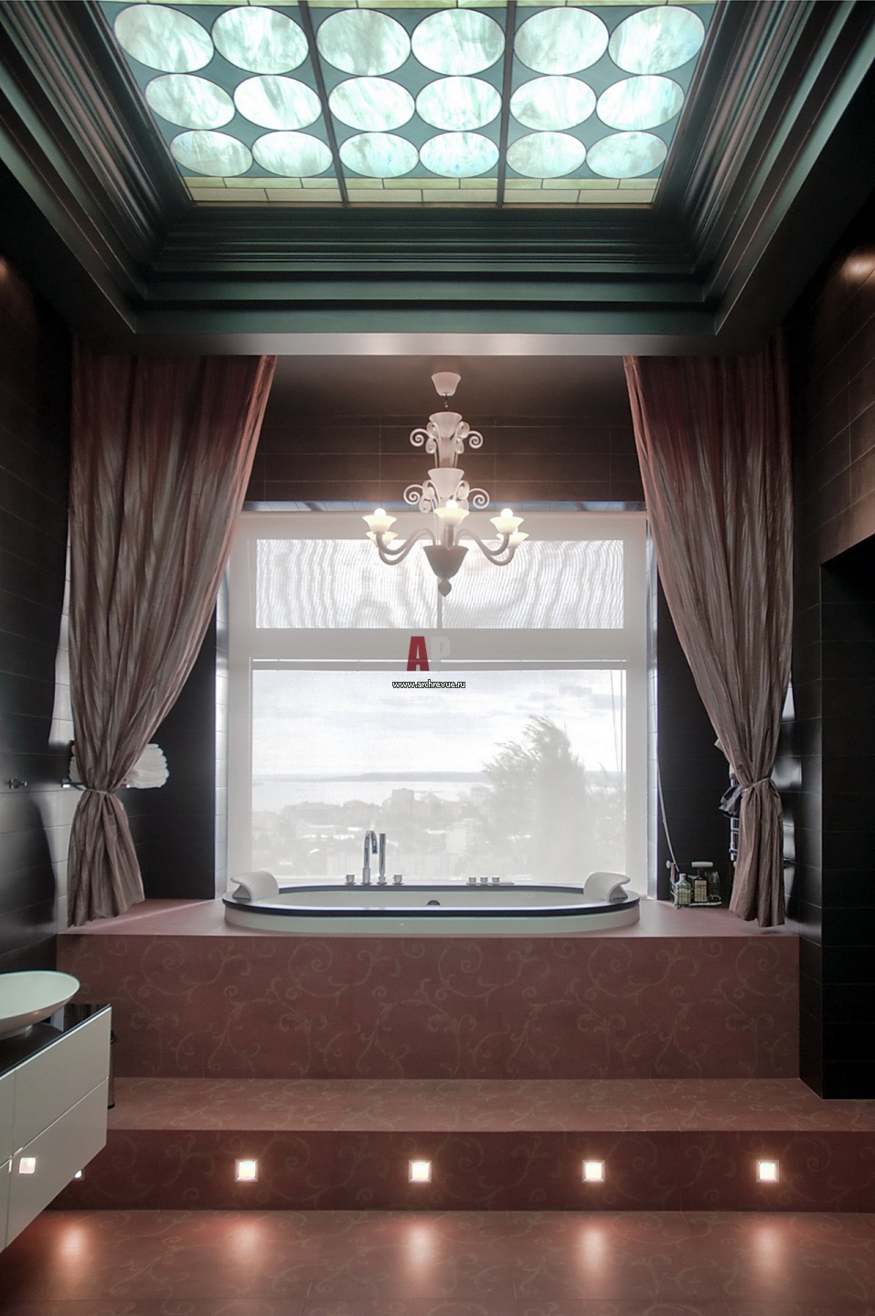 Хозяйский санузел. Ванна установлена на подиуме возле окна. Подиум облицован плиткой Petracer’s с тонким золотым узором. На потолке – витраж с геометрическим орнаментом.