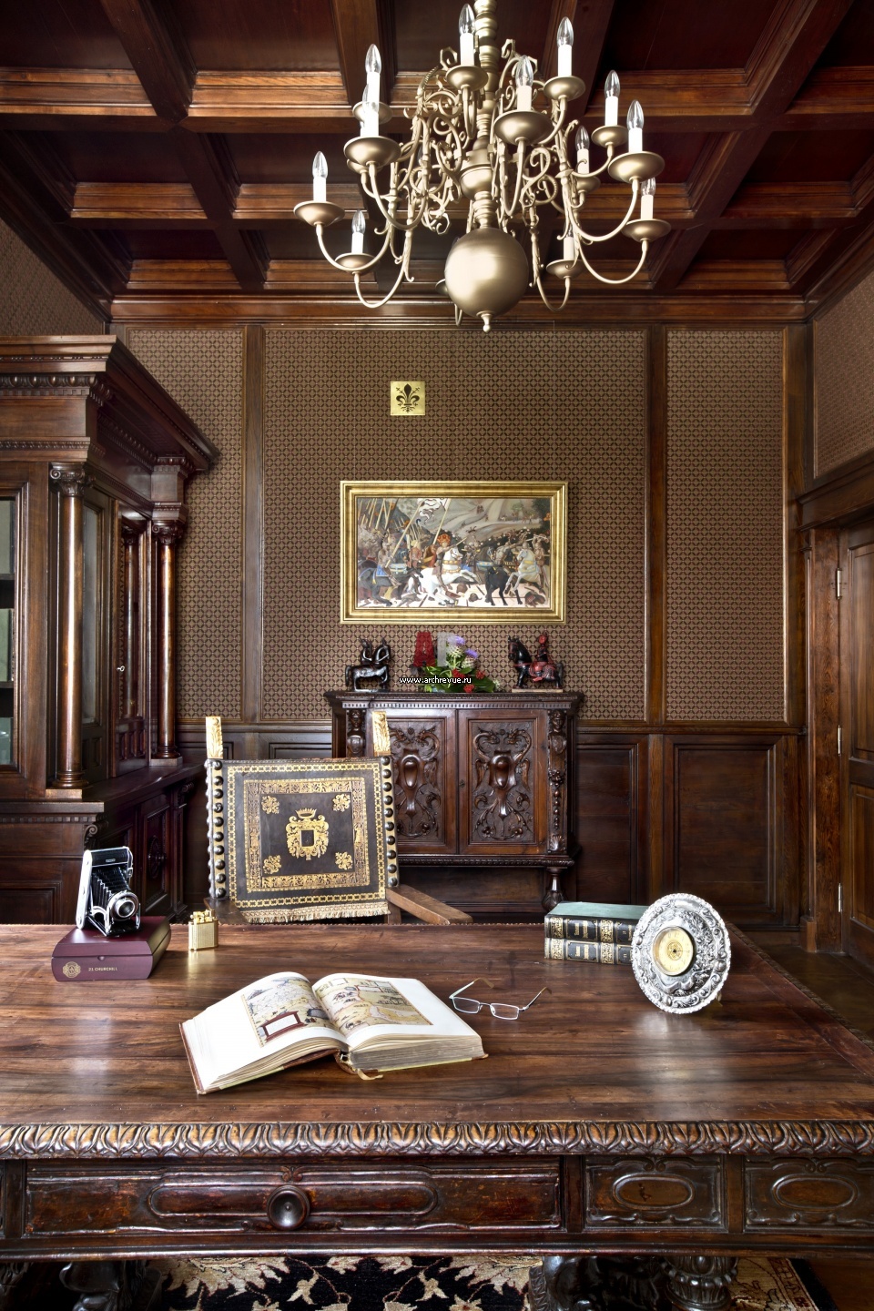 Классический кабинет с кессонным потолком и буазери из бука. Люстры, Preciosa Lighting. На стене – копия картины художника Паоло Учелло «Битва при Сан-Романо».