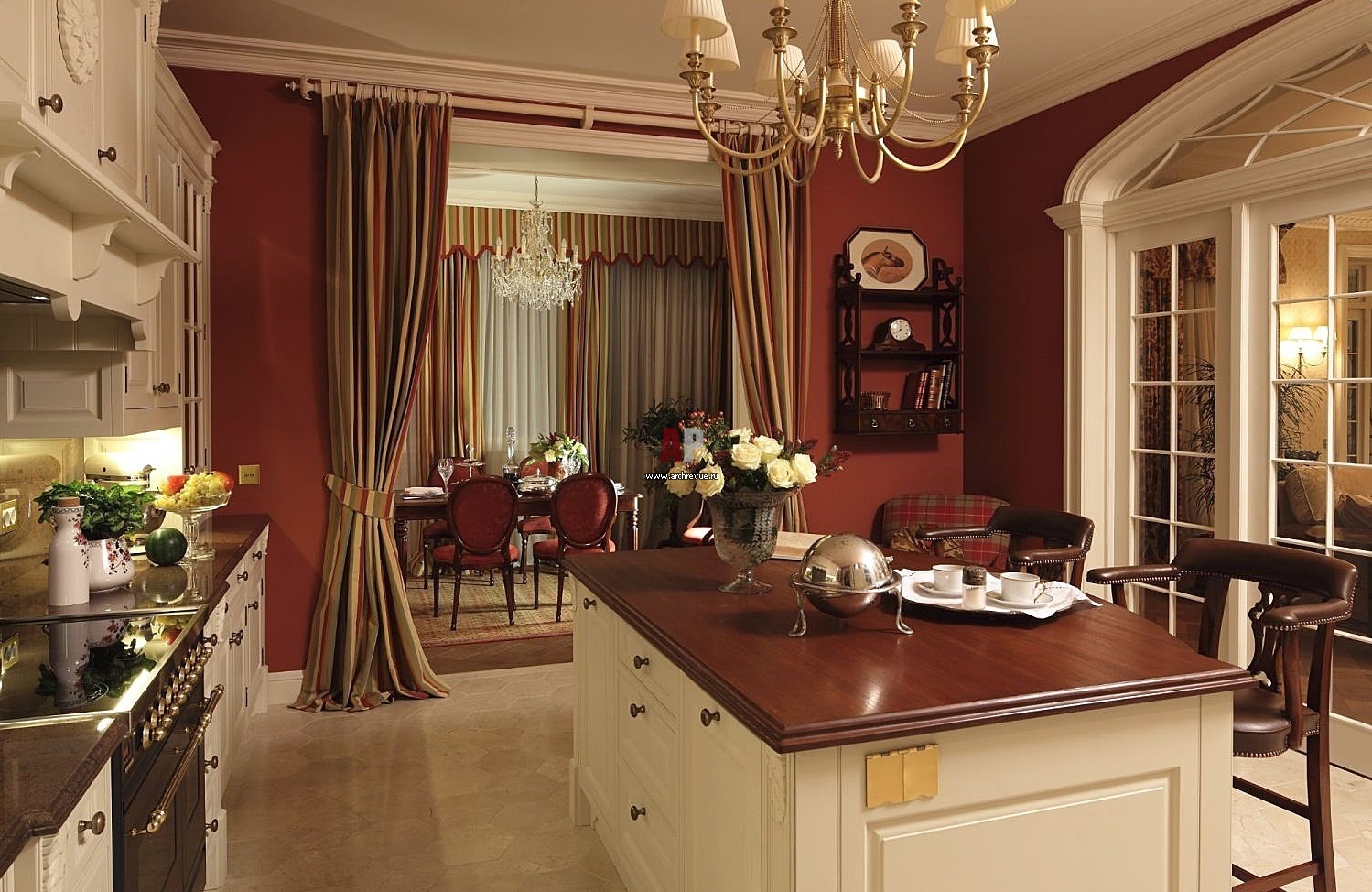 Брусничная столовая решена в едином пространстве с кухней. Обеденный стол, Emile Marqu. Стулья, Titchmarsh & Goodwin. Люстра, Vaughan.