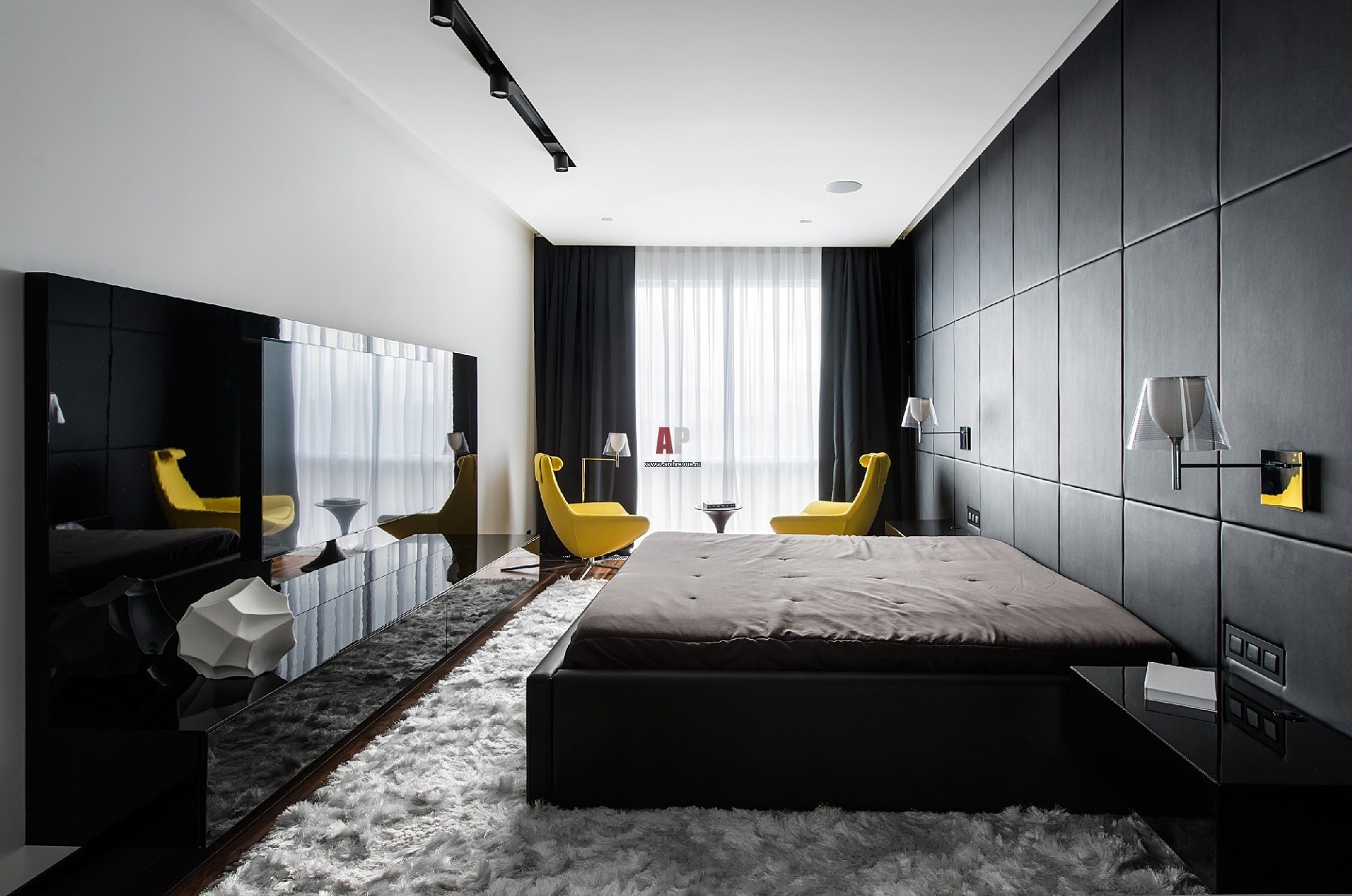 Интерьер спальни решен в стилистике умеренного минимализма. Стена из изголовьем кровати отделана кожаными панелями. На полу – доска из массива ореха. Стеллаж под ТВ, Lema.