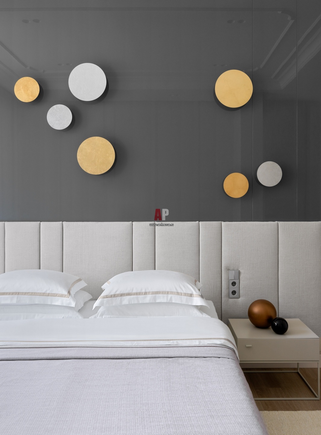 Спальня выполнена в нейтральной серо-бежевой палитре и выглядит легко и изящно. Прикроватный столик, Alf DaFre, модель Hobby.