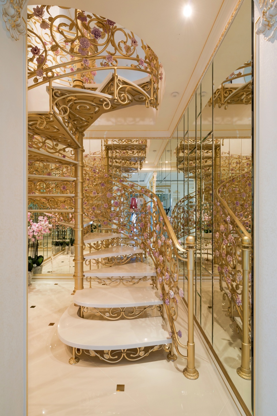 Винтовая лестница с белыми каменными ступенями выполнена из кованого металла, она украшена ажурным декором с позолотой.