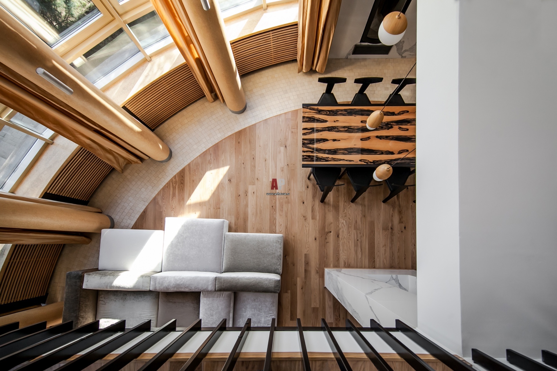 Дом в стиле эко-шик. Двусветная гостиная с радиусным панорамным фасадом. Тонкие колонны вдоль окон облицованы кленовым шпоном «птичий глаз».