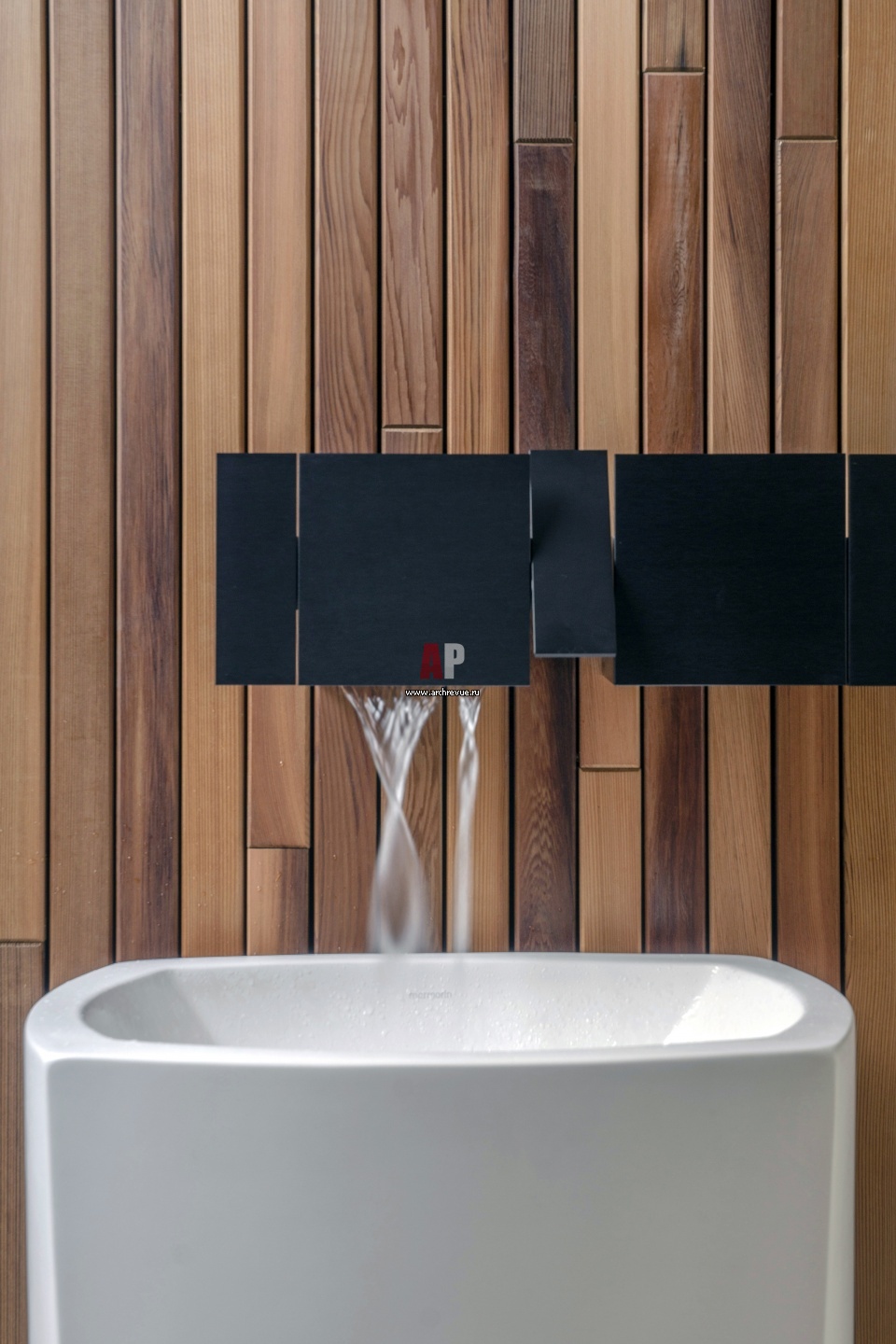 Фрагмент санузла. Стена зашита деревянными панелями. Умывальник, Marmorin.