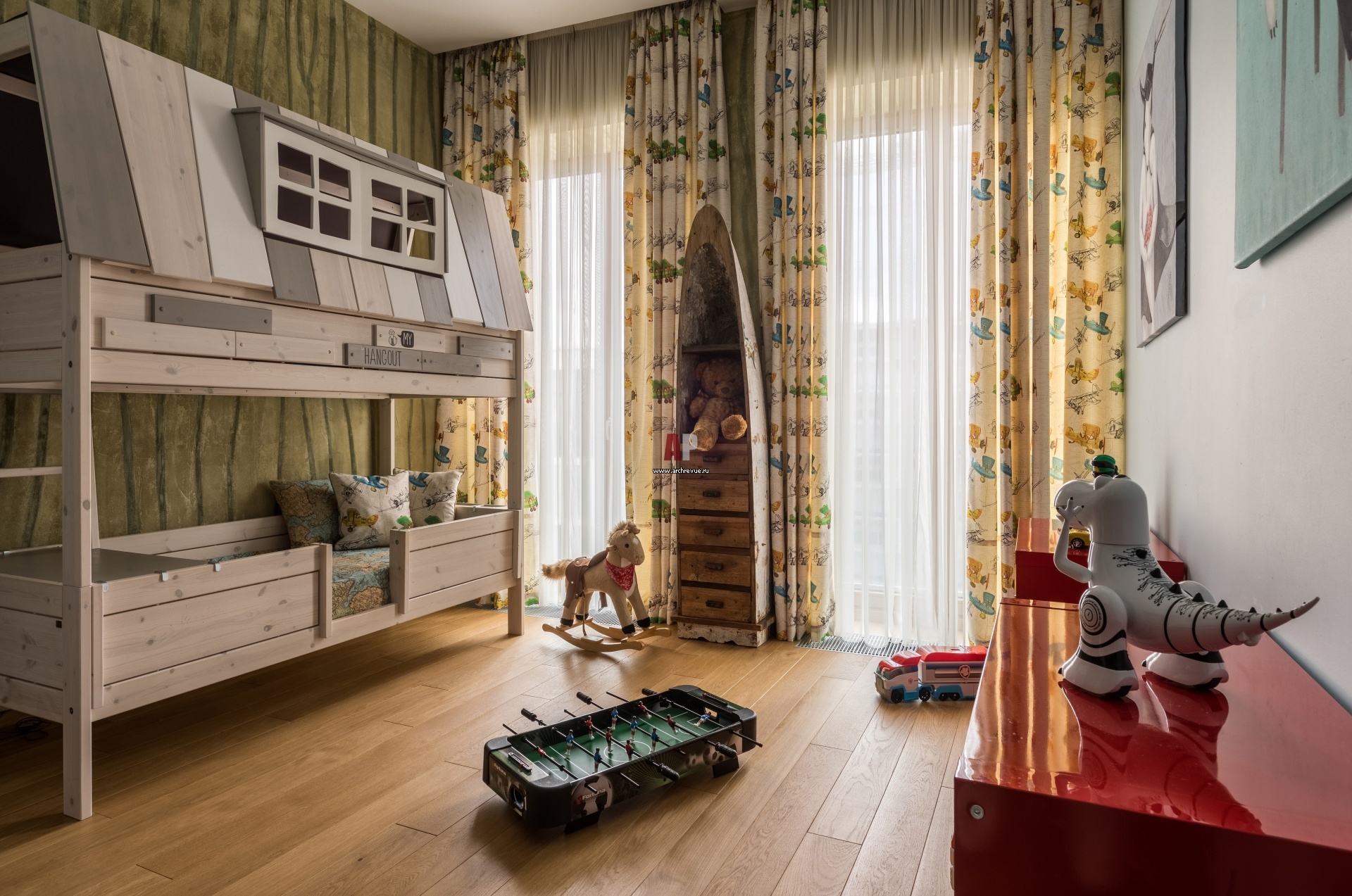 В детской комнате обыграна тема путешествий и приключений. Двухъярусная кровать-домик и декоративная штукатурка в зеленых тонах вызывают ассоциации с джунглями.