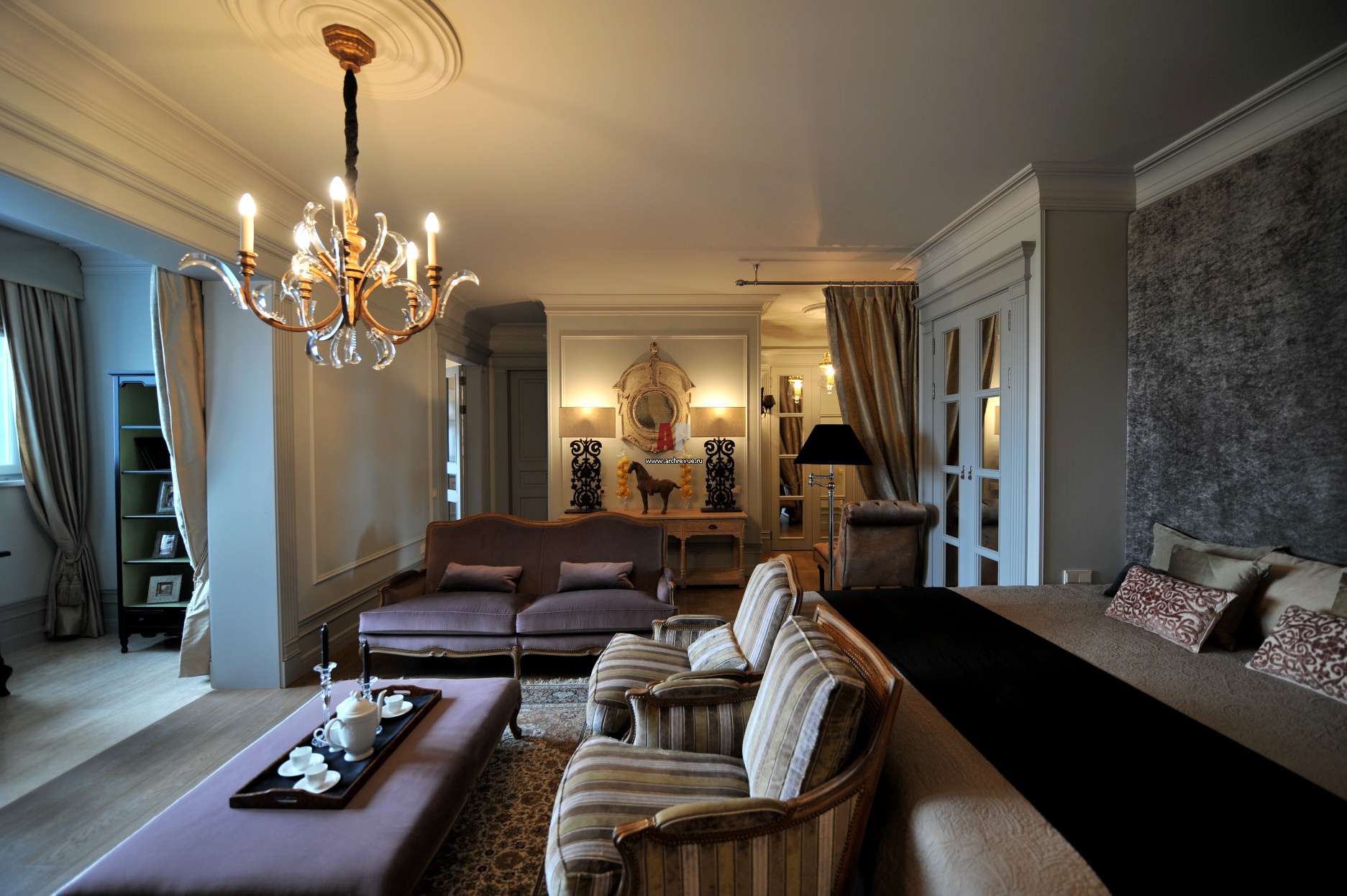 Квартира решена как лофт: прихожая, гостиная, спальня, кабинет объединены в общее пространство. Интерьер выглядит сдержанно и благородно благодаря цветовой гамме из спокойных, как будто бы припыленных оттенков серого. Сложной серебристой краской выкрашены стены, двери, встроенные шкафы, плинтуса и потолок.
