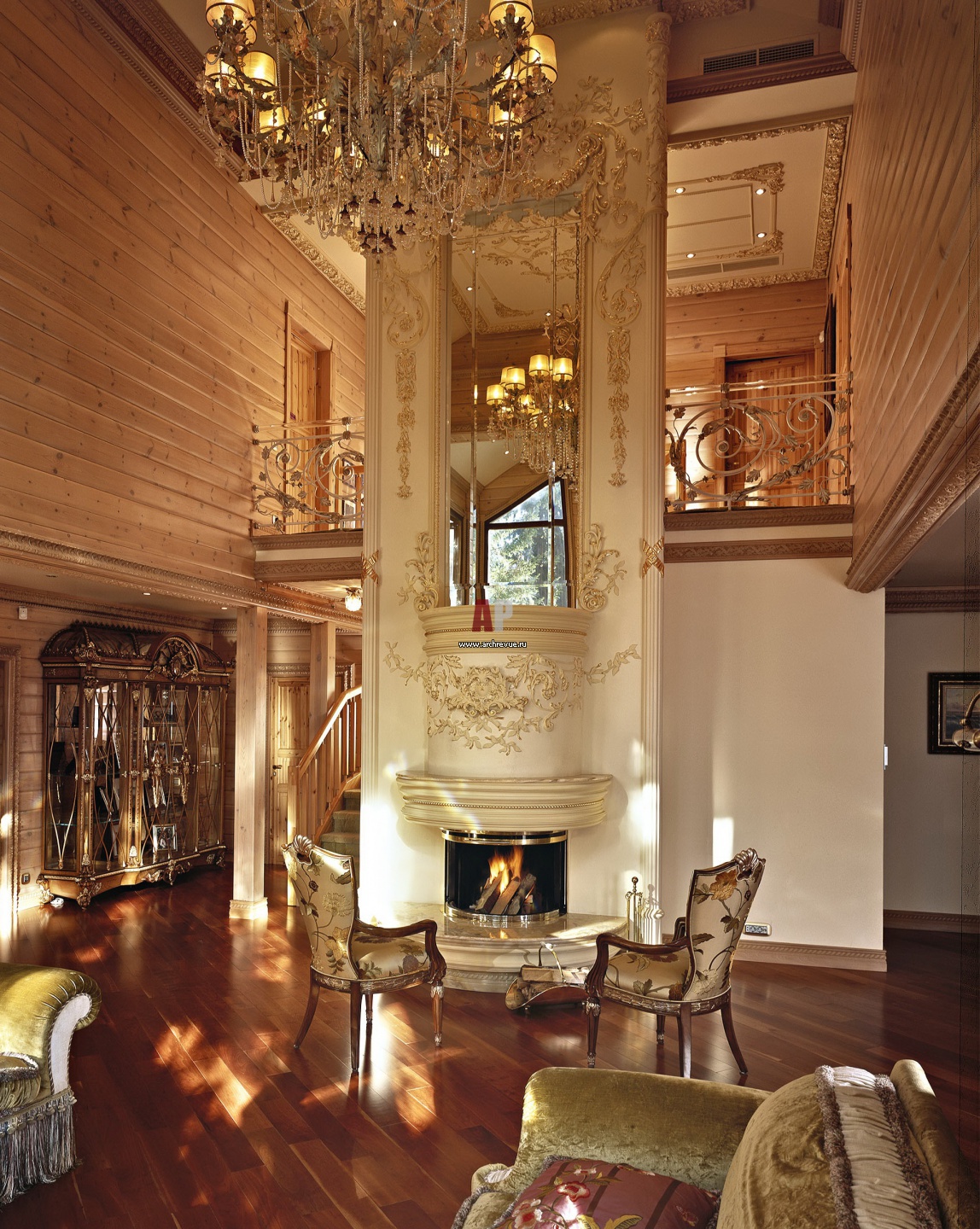 Центральный элемент гостиной – камин. Лепной декор и зеркала в оформлении дымохода камина придают интерьеру торжественный облик. Люстра, Pataviumart.