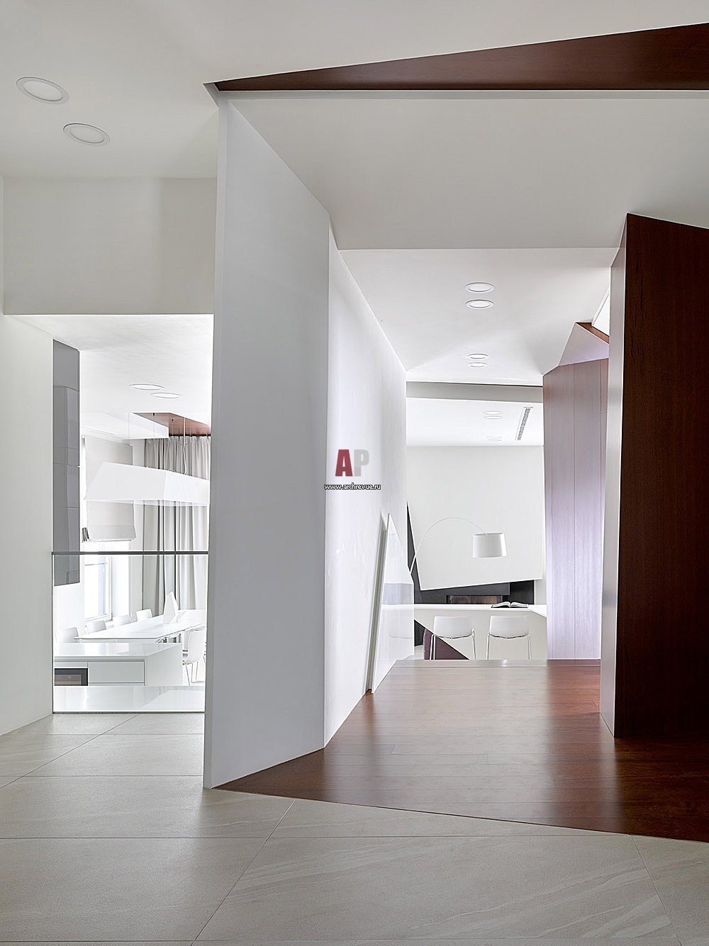 Интерьер минималистского дома со сложными объемами, динамичными формами, ритмичным декором и нестандартными архитектурными приемами.
