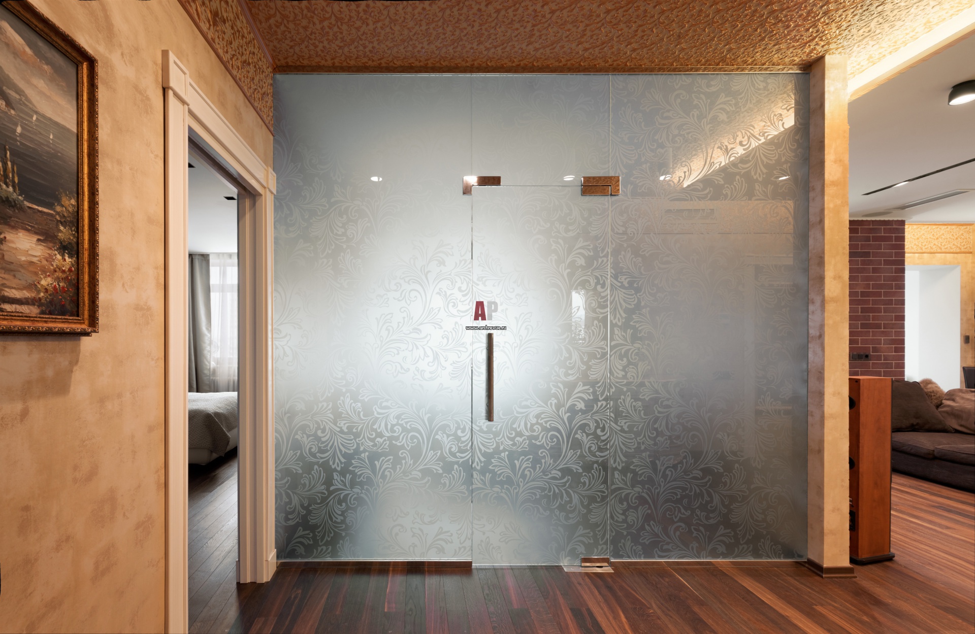 Чтобы впустить больше воздуха в пространство, вместо глухих межкомнатных дверей в гостевой спальне использовались стеклянные конструкции на всю высоту помещения. Дверь и стеклянный портал с пескоструйным рисунком, Legnoform.