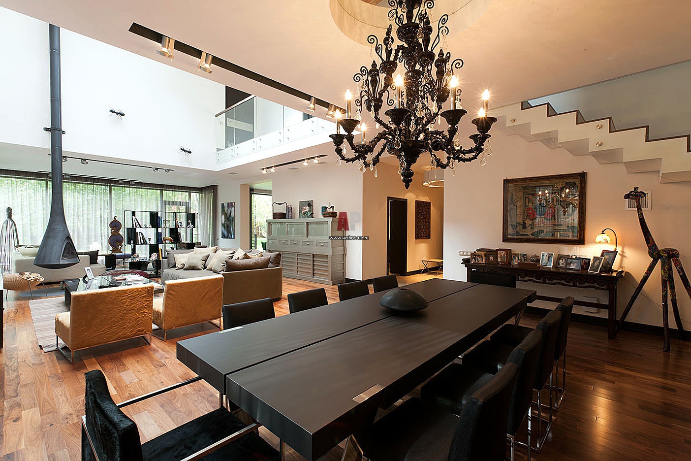 Интерьер двусветной гостиной, объединенной со столовой. Стены монохромные, они выкрашены в белый цвет. Эклектичная мебель от модных европейских домов, поставщик R-Studio.