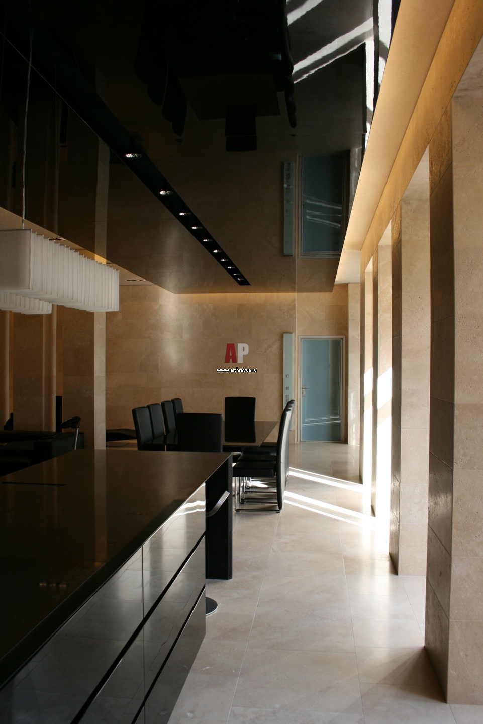 Кухня расположена на месте присоединенного балкона и выделена черной глянцевой «дорожкой» на потолке. Кухонный гарнитур Minotti выдержан в общей стилистике квартиры: его отличают четкие формы и отделка фасадов черным лаком.
