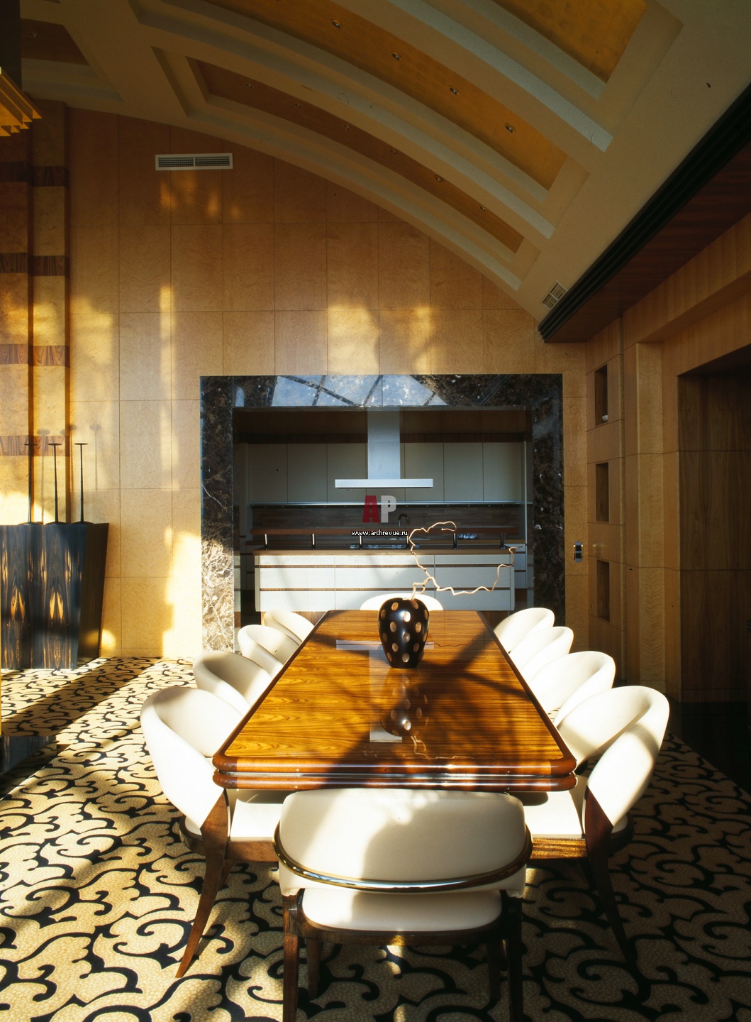 Вид из столовой на зону кухни. Широкий дверной проем отделан полированным камнем, поставщик «ЛКамень».
