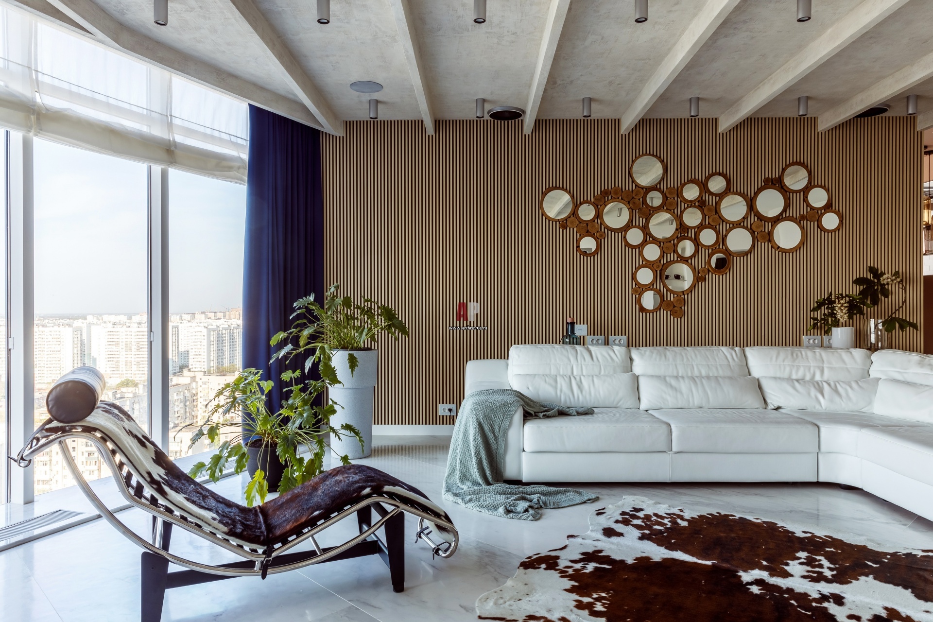 Стена за диваном в гостиной оформлена гипсовыми панелями, имитирующими деревянную реечную раскладку. Потолок оформлен гипсовой штукатуркой род бетон. Декоративные балки поддерживают геометрию помещения и придают динамику. Кресло-шезлонг, Cassina, модель LC4, по дизайну ле Корбюзье.