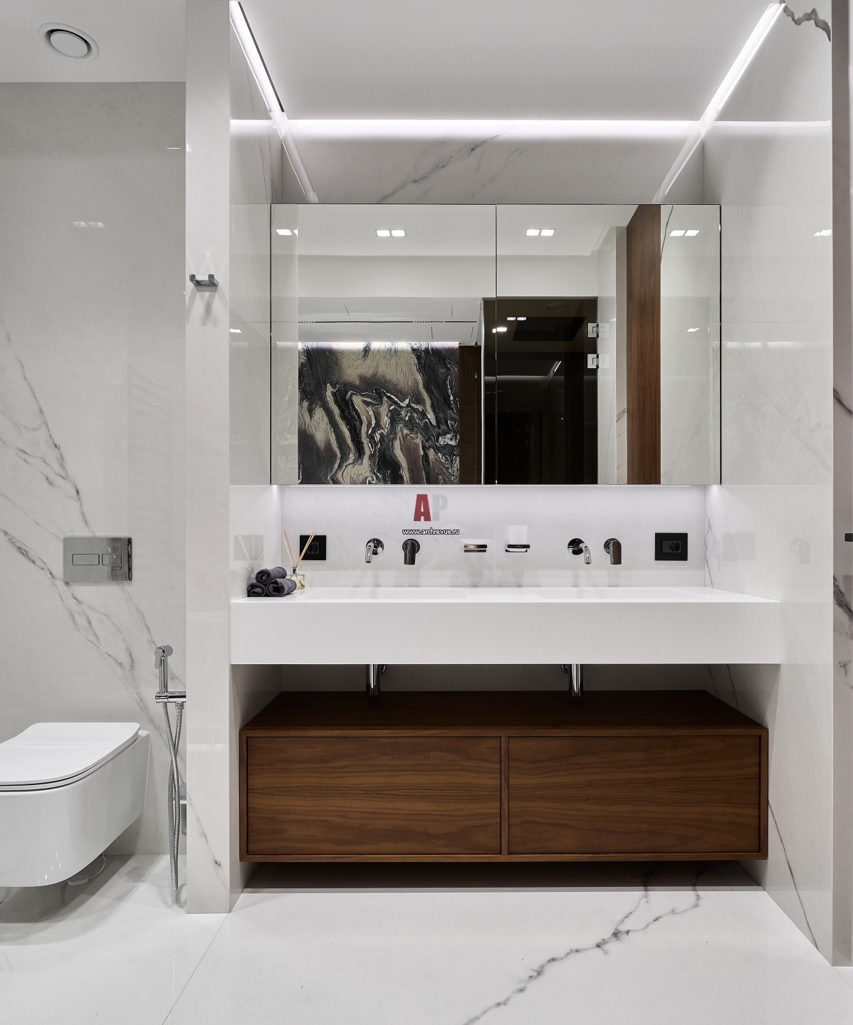 Санузел при гостевой спальне. Стены и пол – белый крупноформатный керамогранит. Умывальник с тумбой, на заказ.