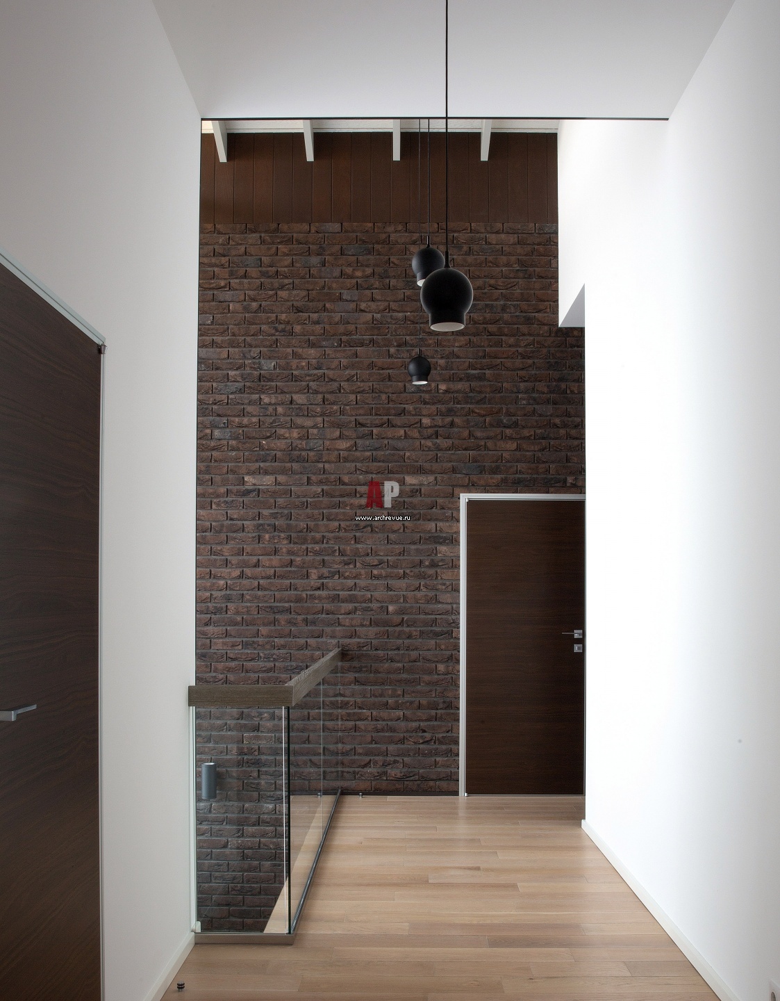 В холле дома в индустриальном стиле белые поверхности сочетаются с кирпичными плоскостями.