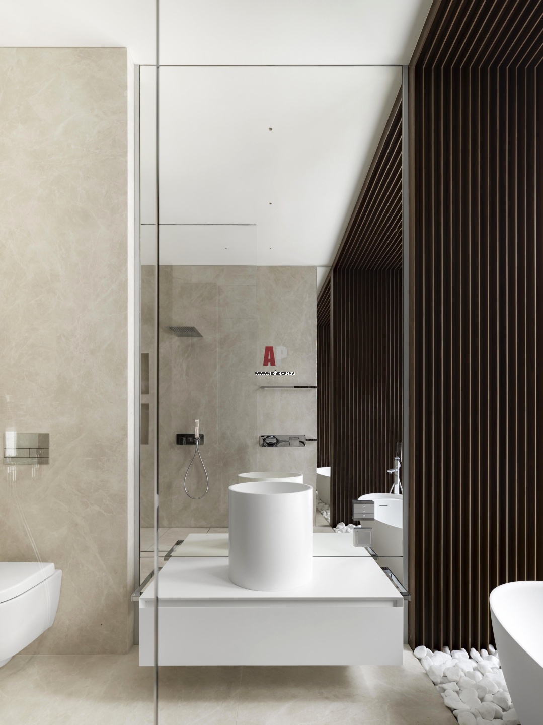 Хозяйская ванная комната облицована бежевым камнем. На белой тумбе – раковина, Agape. Смеситель, Gessi.