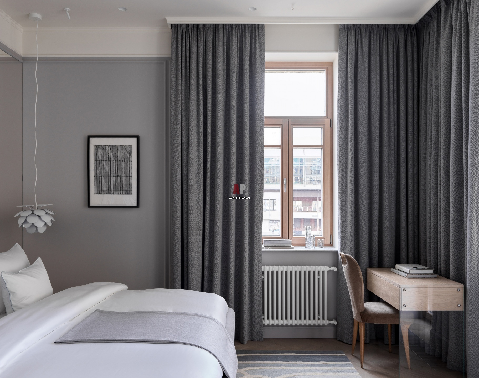 Хозяйская спальня выполнена в уютной серой гамме. Шторы из текстиля, Mark Alexander.