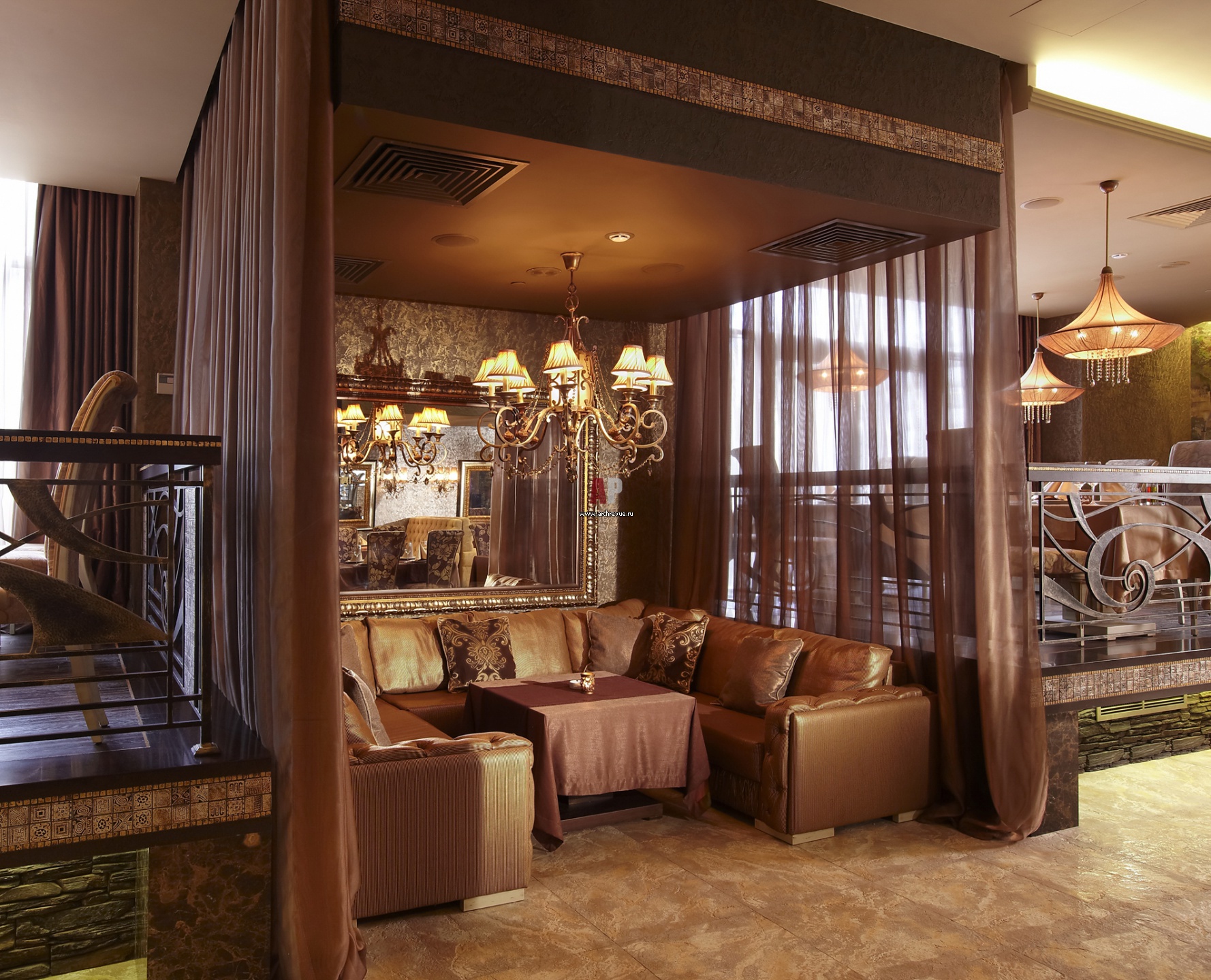 Зона отдыха решена как восточный шатер. Люстры с кристаллами Swarovski и тканевыми абажурами выполнены авторами проекта. Мебель – по эскизам дизайнеров, изготовление Beni.