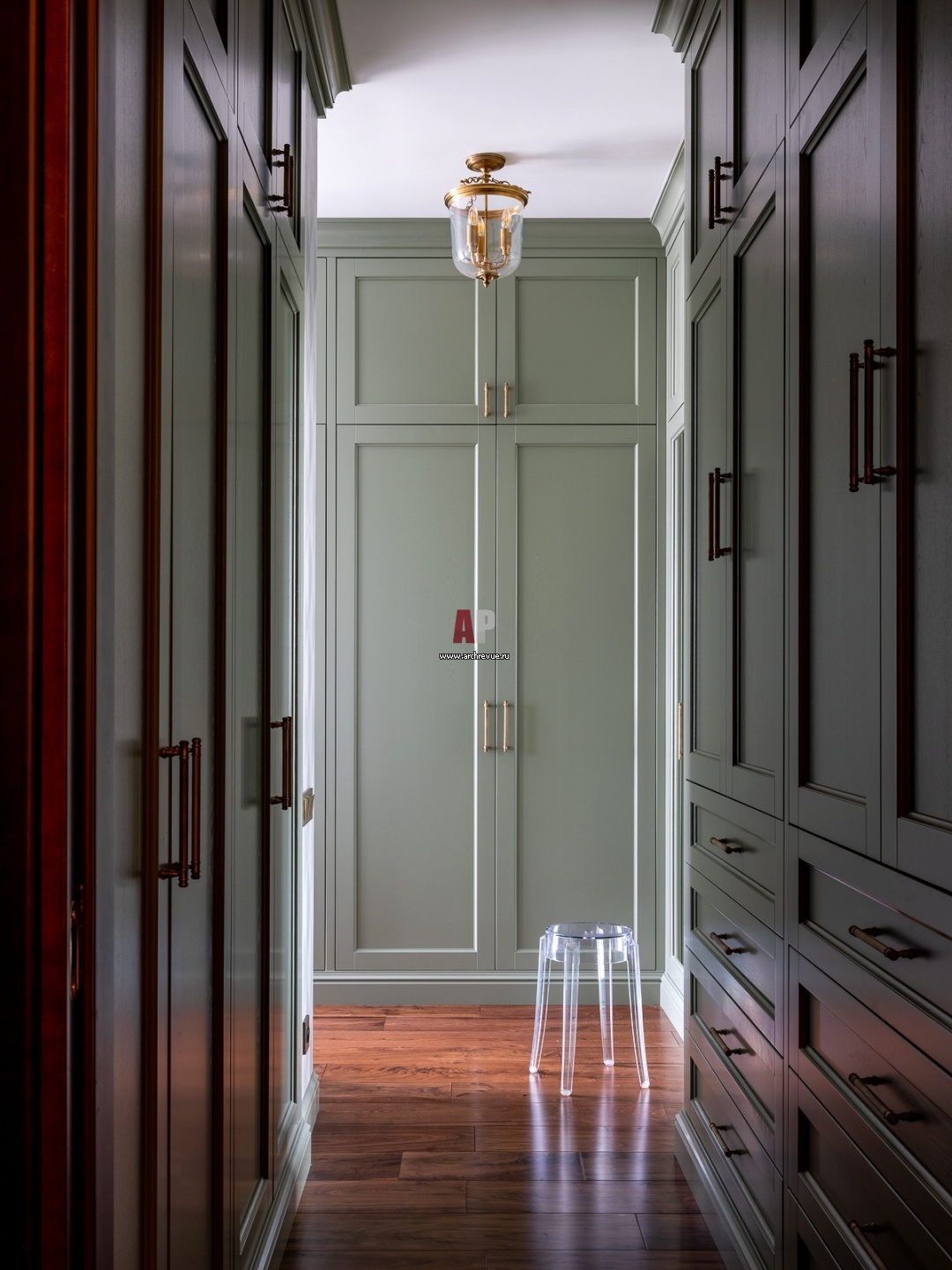 При входе в спальню родителей расположена большая гардеробная. Дверцы выкрашены в оливковый цвет и оформлены зеркалами. Табурет, Kartell.