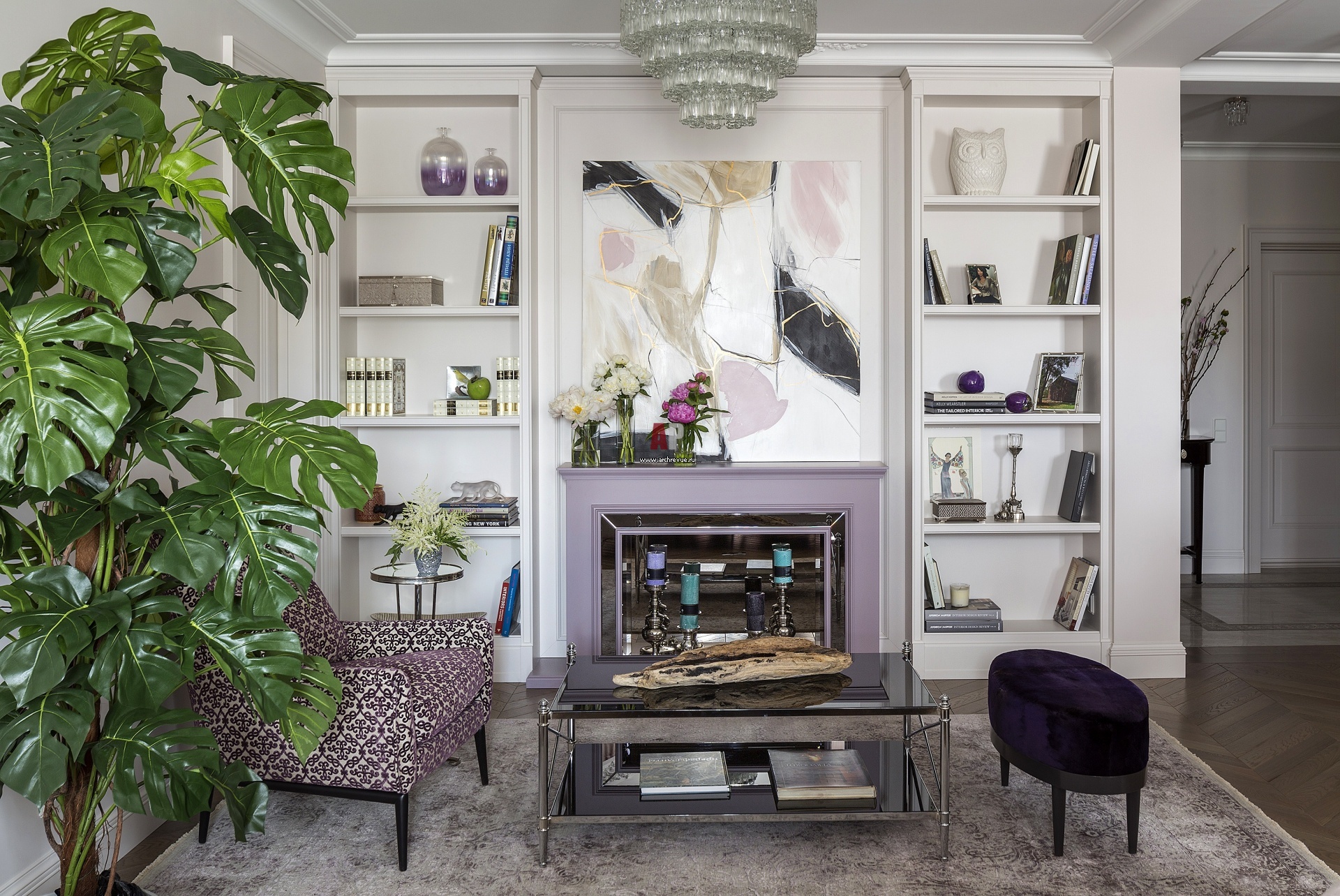 Гостиная с фальш-камином. Припыленный сиреневый портал камина выполнен из дерева и обрамлен стеллажами для хранения книг и мелких предметов. Кресло, Softhouse. Журнальный столик из латуни.